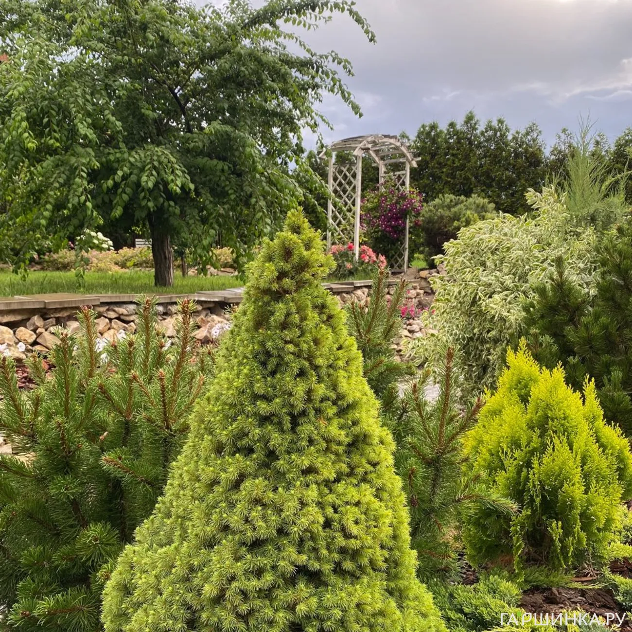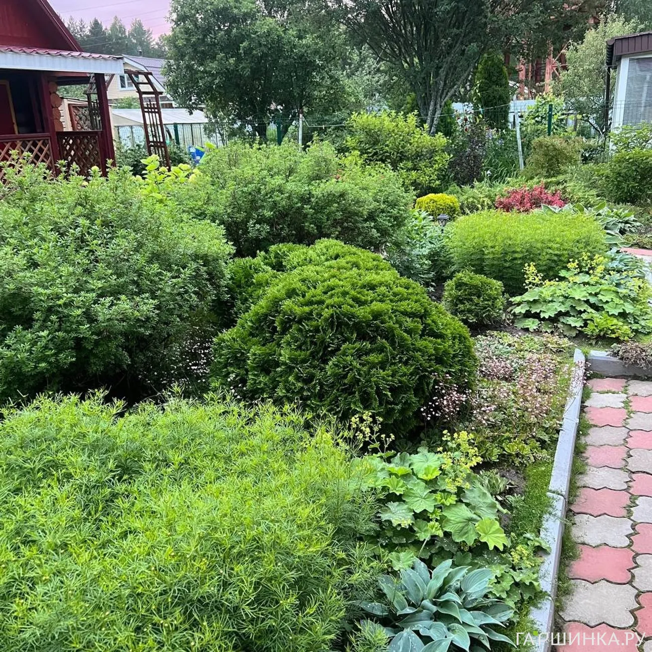 Добрый день, уважаемые друзья! Я - Галина. Сад мой в Западной Сибири, в Омске. Очень люблю хвойные. Именно они украшают сад в любое время года. Особенно хороши промозглой осенью и ранней весной, когда сад практически пуст. Выращиваю туи, можжевельники, ели, сосны, горные сосны. На фото на переднем плане можжевельник Минт Джулеп, за ним на противоположной стороне пруда горная сосна Муго Пумилио. Слева от неё туя Смарагд, стриженная двумя шарами, справа виден можжевельник Блу Эрроу. По центру небольшой Голоден Смарагд, крону которого мы поддерживаем в форме яйца.
