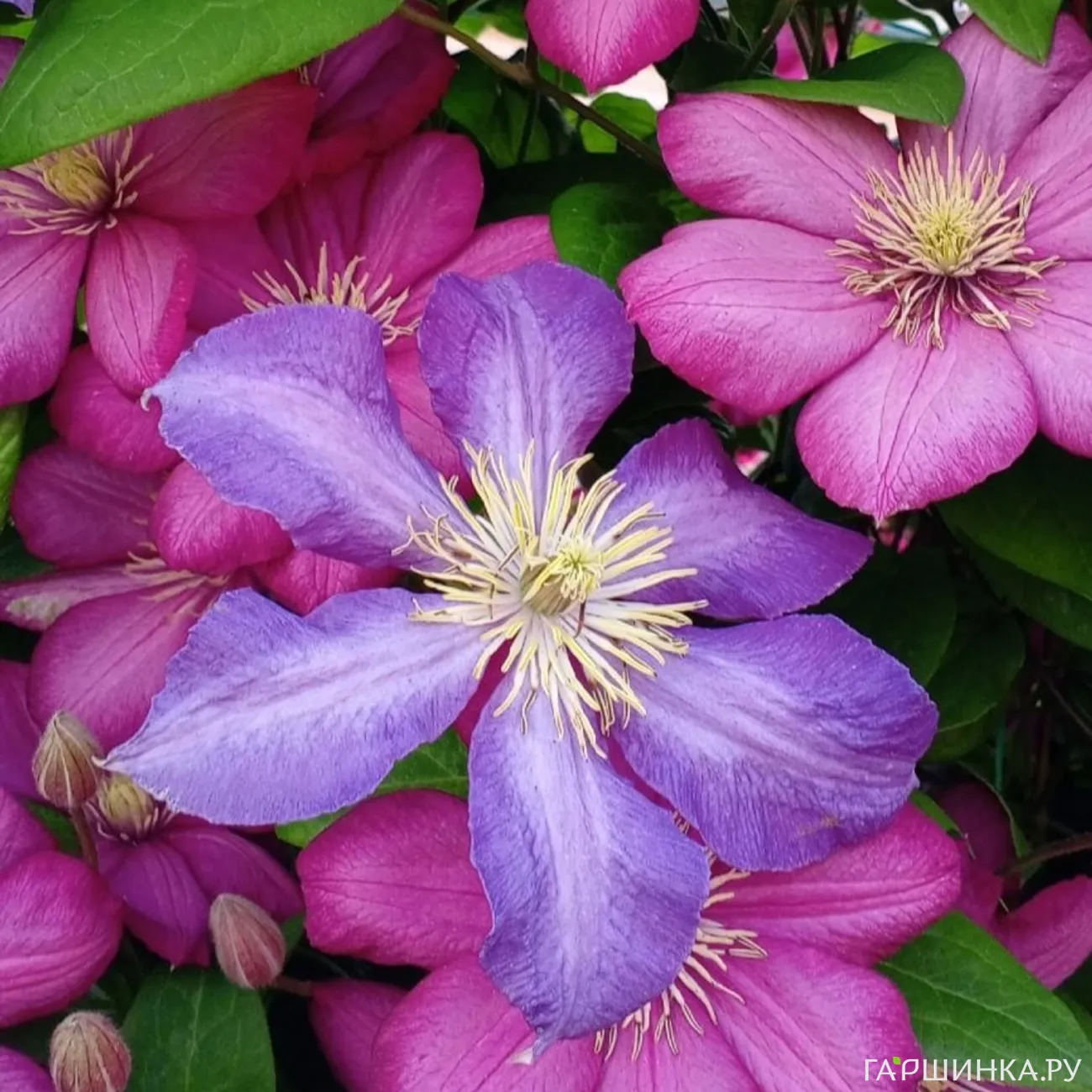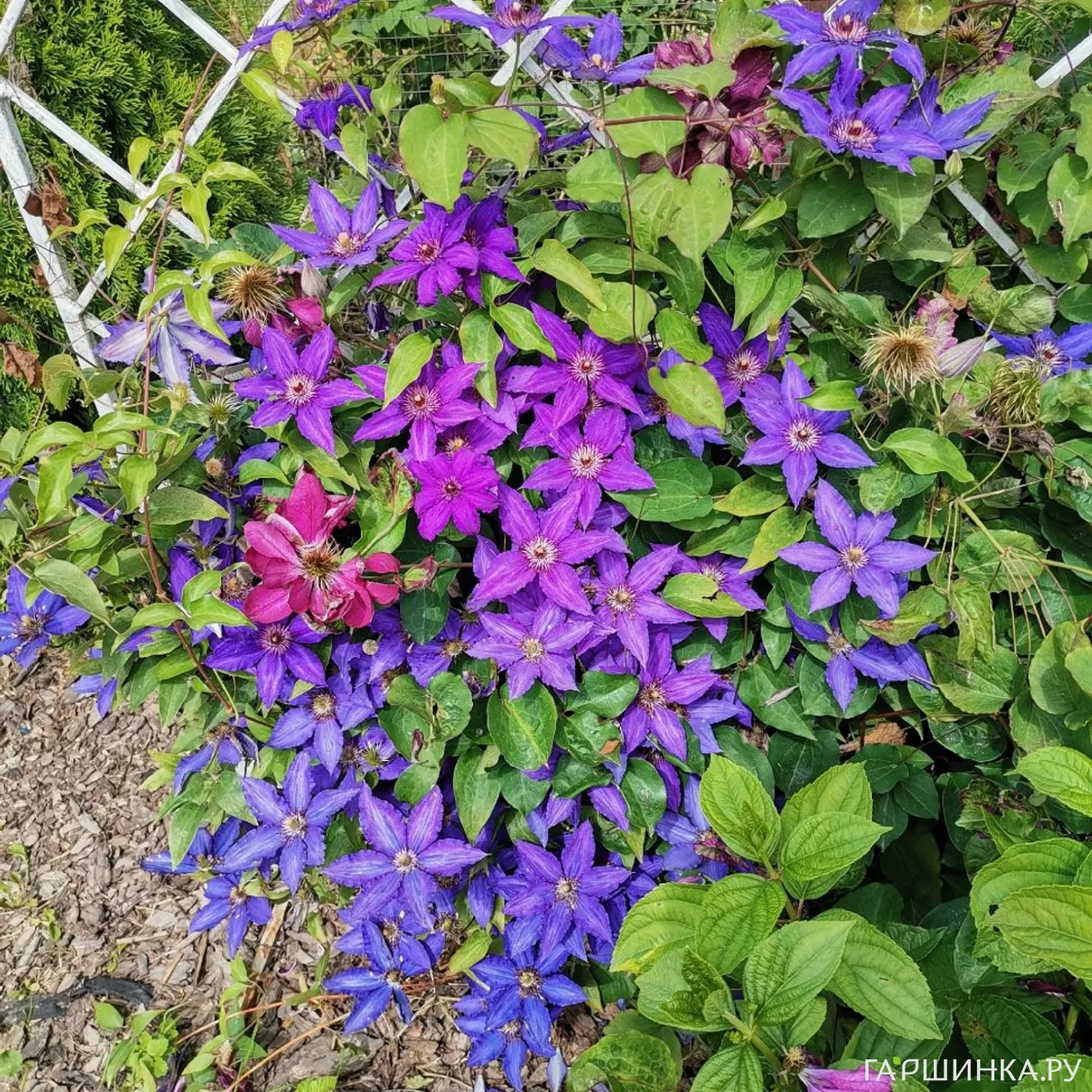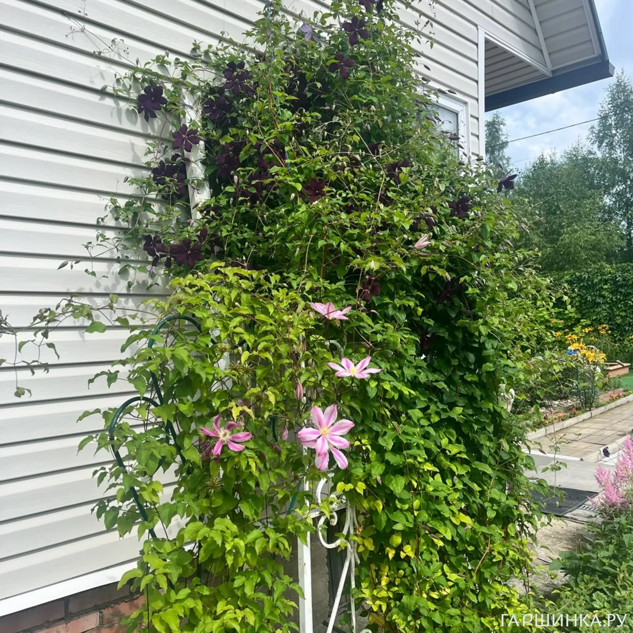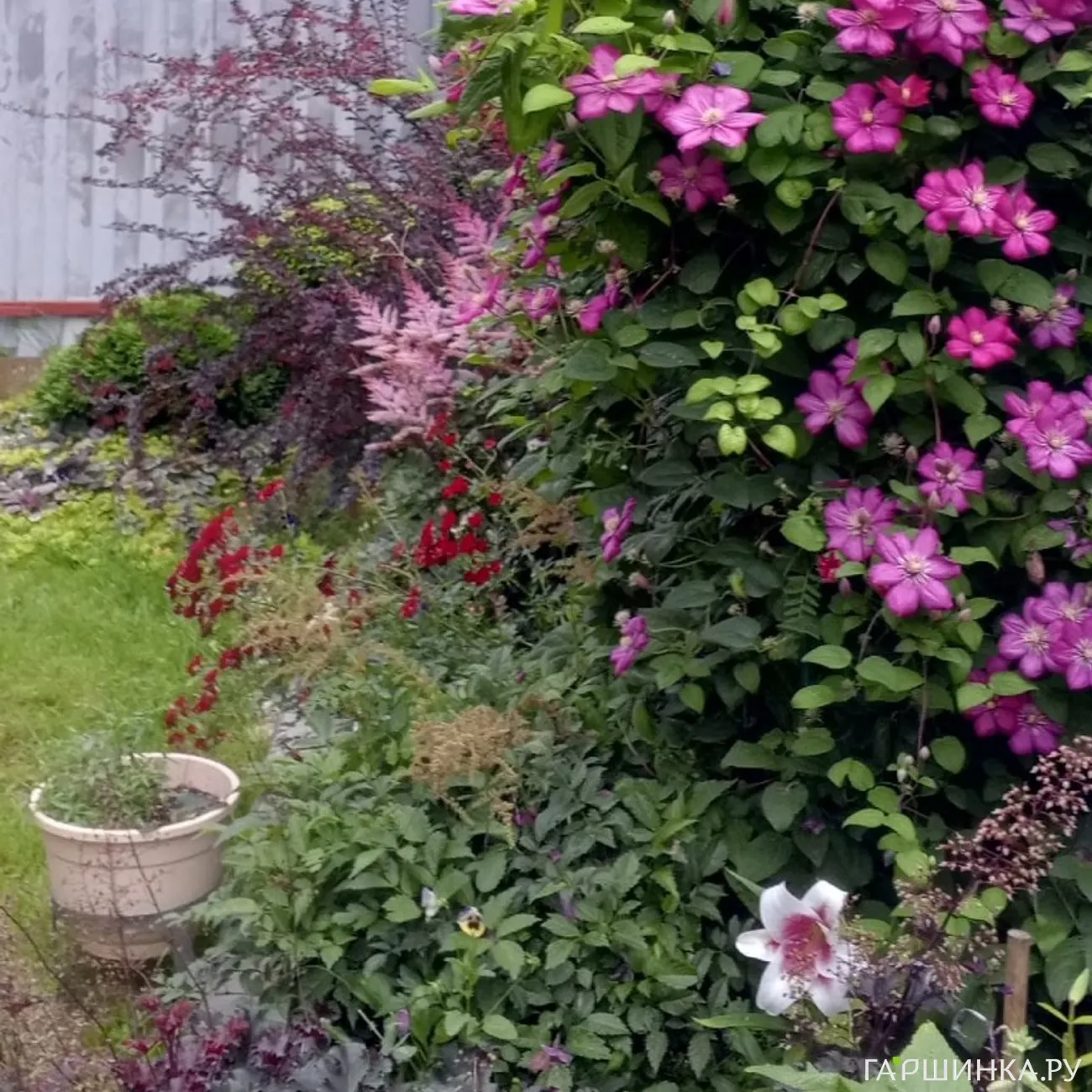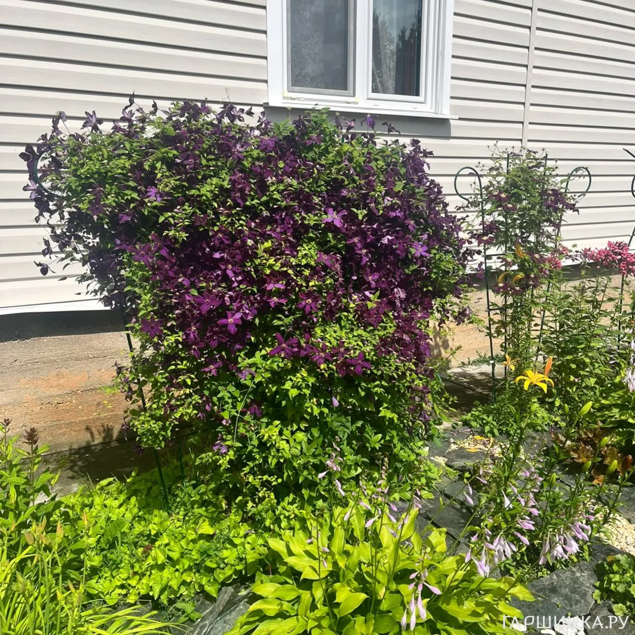 В палисаднике давно растут клематисы: Вилль де Лион и сине-сиреневый, названия которого я не помню.Сиреневый клематис пока слабый и теряется в зарослях Вилль де Лиона, цветет не так обильно, как хотелось бы. На протяжении этих четырёх лет картинки менялись: какие-то растения уходили из сада, появлялись новые...
