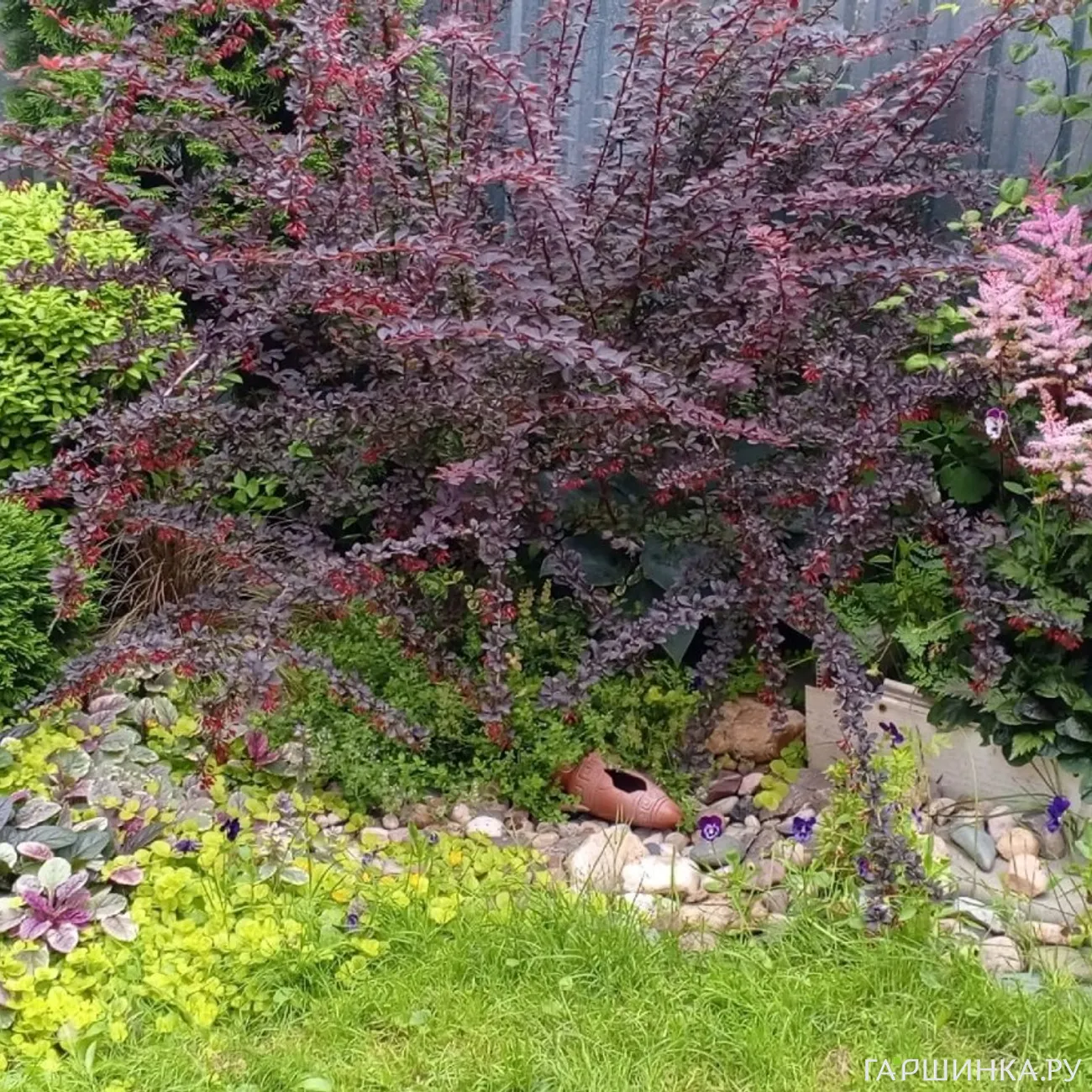 Когда у меня появился небольшой участок земли, мне захотелось его превратить в райский сад. Сначала я просто сажала всё подряд, основываясь на желании скорее создать цветущий уголок. Было сделано много ошибок поначалу, много пересаживала, меняла концепцию , пересматривала цветовое решение, чтобы избежать излишней пестроты. Да и сейчас ещё много всего хотелось бы переделать и воплотить в жизнь свои задумки . Мой садик и сейчас далёк от идеала... Стремясь облагородить палисадник, я посадила жасмин на том самом месте, где много лет назад вырубили сирень. Но жасмин рос кривеньким и постоянно поражался тлёй, как бы я его ни обрабатывала. Я стала читать о растениях , покупала журналы о саде. И читая о чужом опыте, рассматривая фотографии европейских садов, постепенно пришла к пониманию, какие растения мне подойдут, какие условия надо создать тому или иному цветочку, какие из них надо сажать в полутени, а какие любят солнце... и вообще, какую картину мне хотелось наблюдать в моем саду.Решила, что будет лучше, если я откажусь от цветущих многолетников в полутени входной зоны и посадила хвойные растения и кустарники, которые можно сформировать: тую Смарагд, которая растет в виде высокой свечи, рядом с ней посадила бирючину, которую решено было стричь в форме шара, как равновесие ещё один шар - туя Даника и с другой стороны Смарагда- барбарис Тумберга с ярко пурпурной листвой. В ногах у этих кустарников я посадила хосты, травы (акая то осока, которая не расползается, а сидит небольшой кочкой). Сизые хосты оттенили яркую листву барбариса. Я сделала бордюр- сухой ручей из камней. В камнях растут чабрец, молодила, живучка сортовая.
