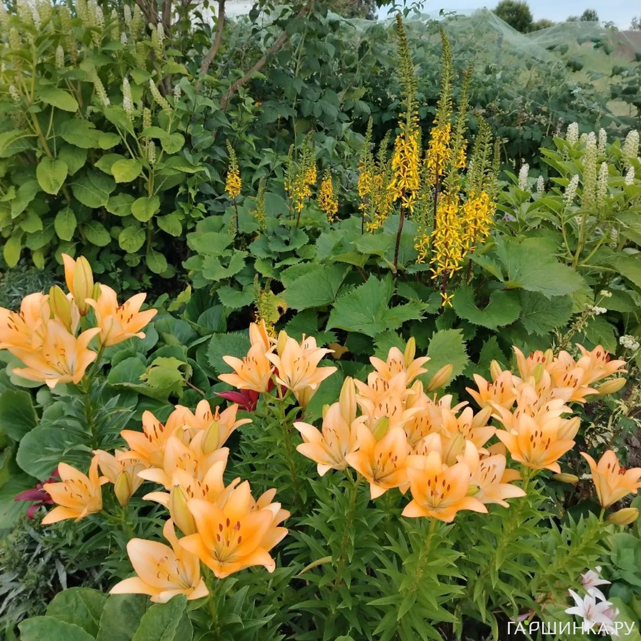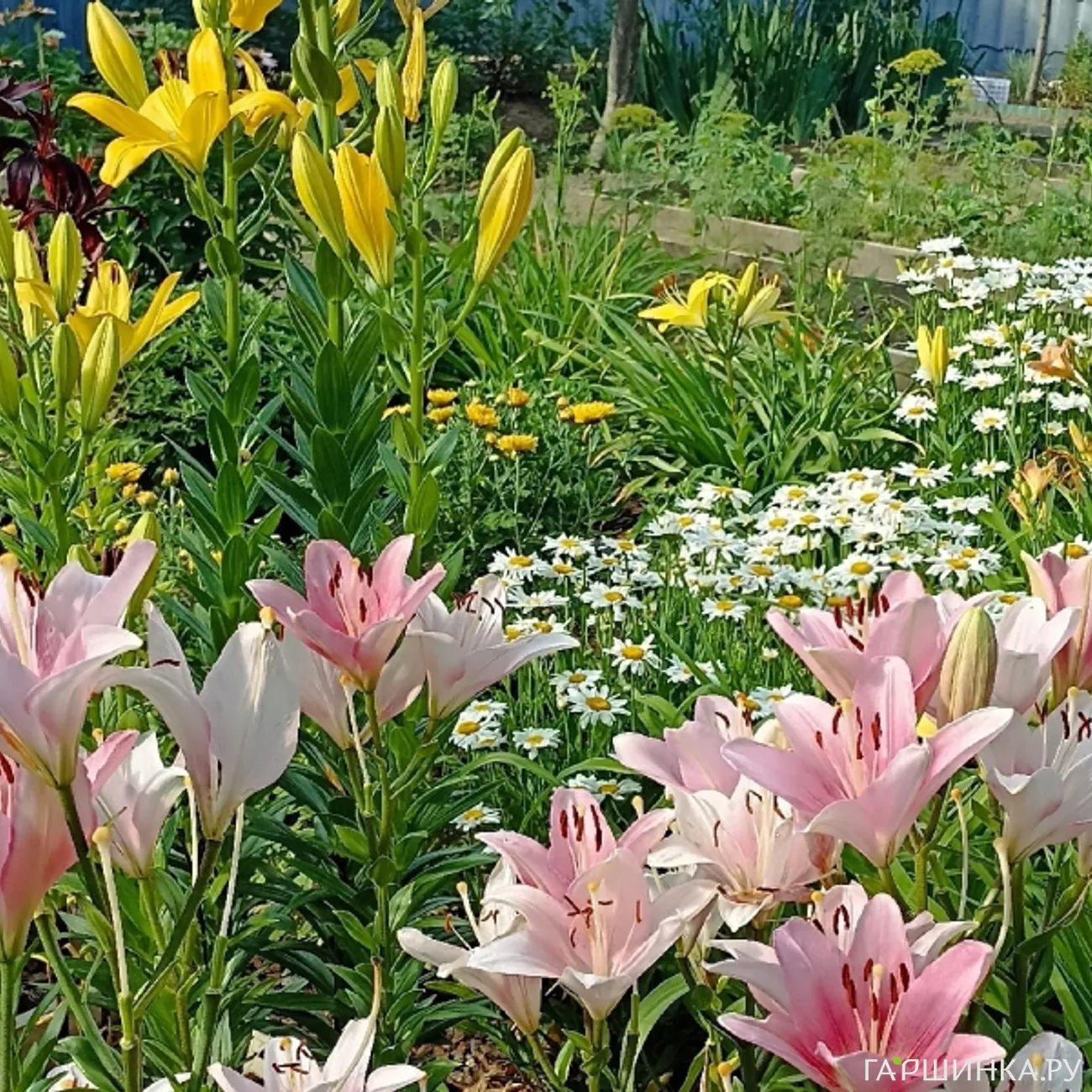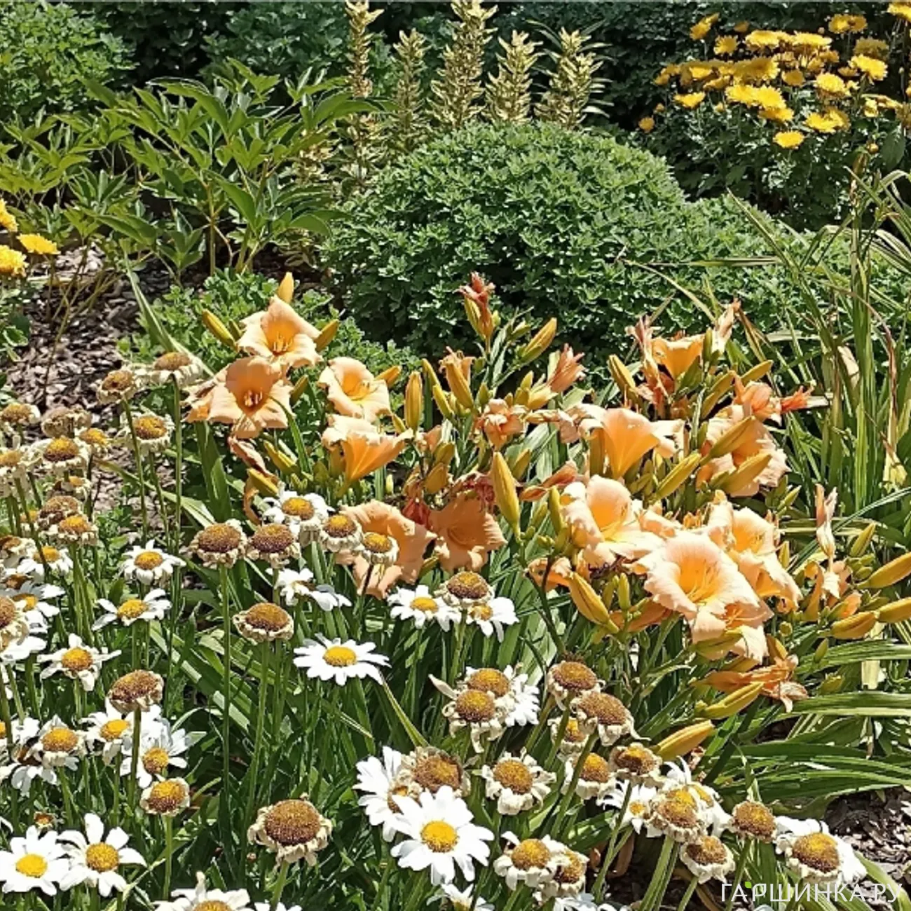 Лилии, лилейники, нивяник, хризантема корейская, цветущая летом, и мультифлора, эхинацея, тысячелистник, пионы.