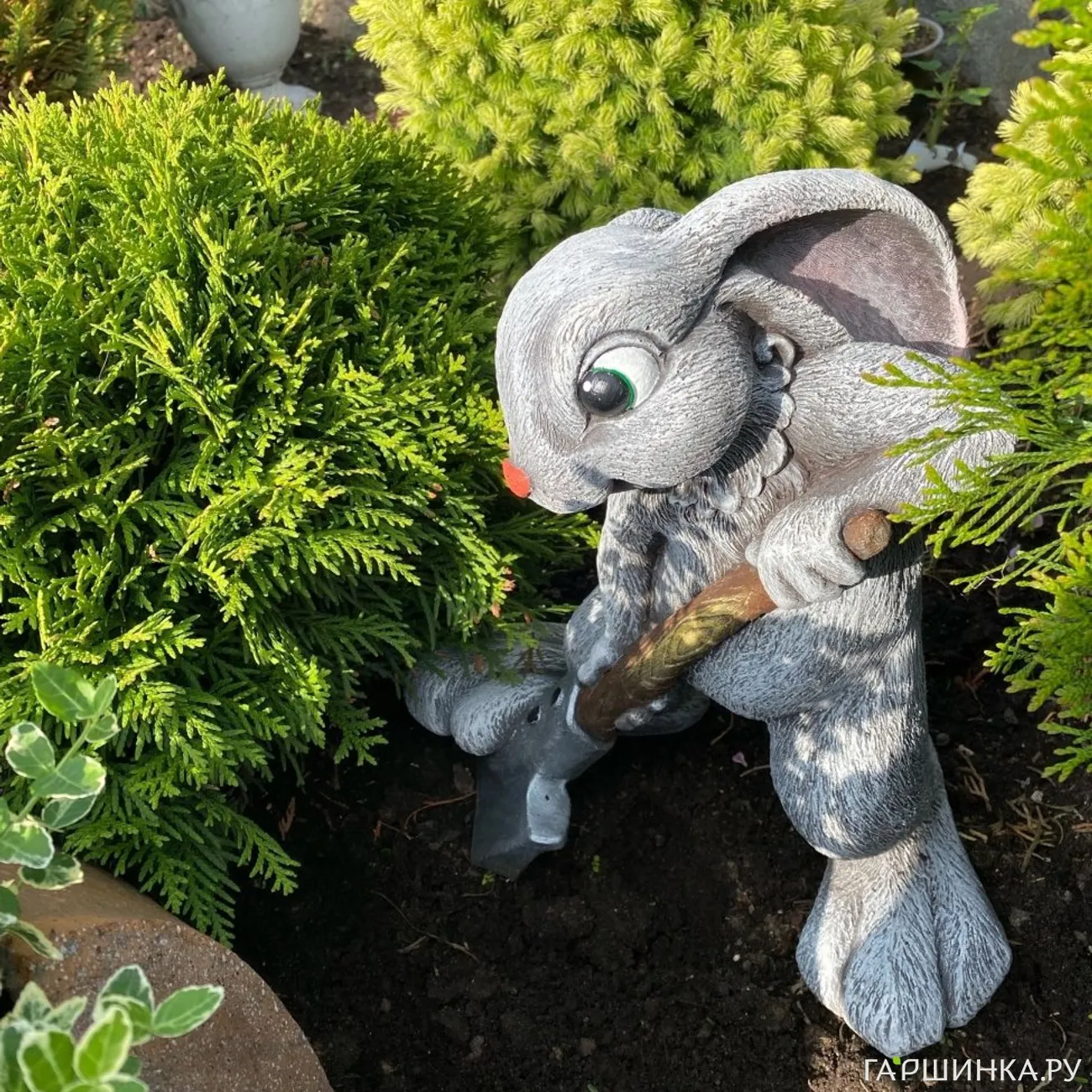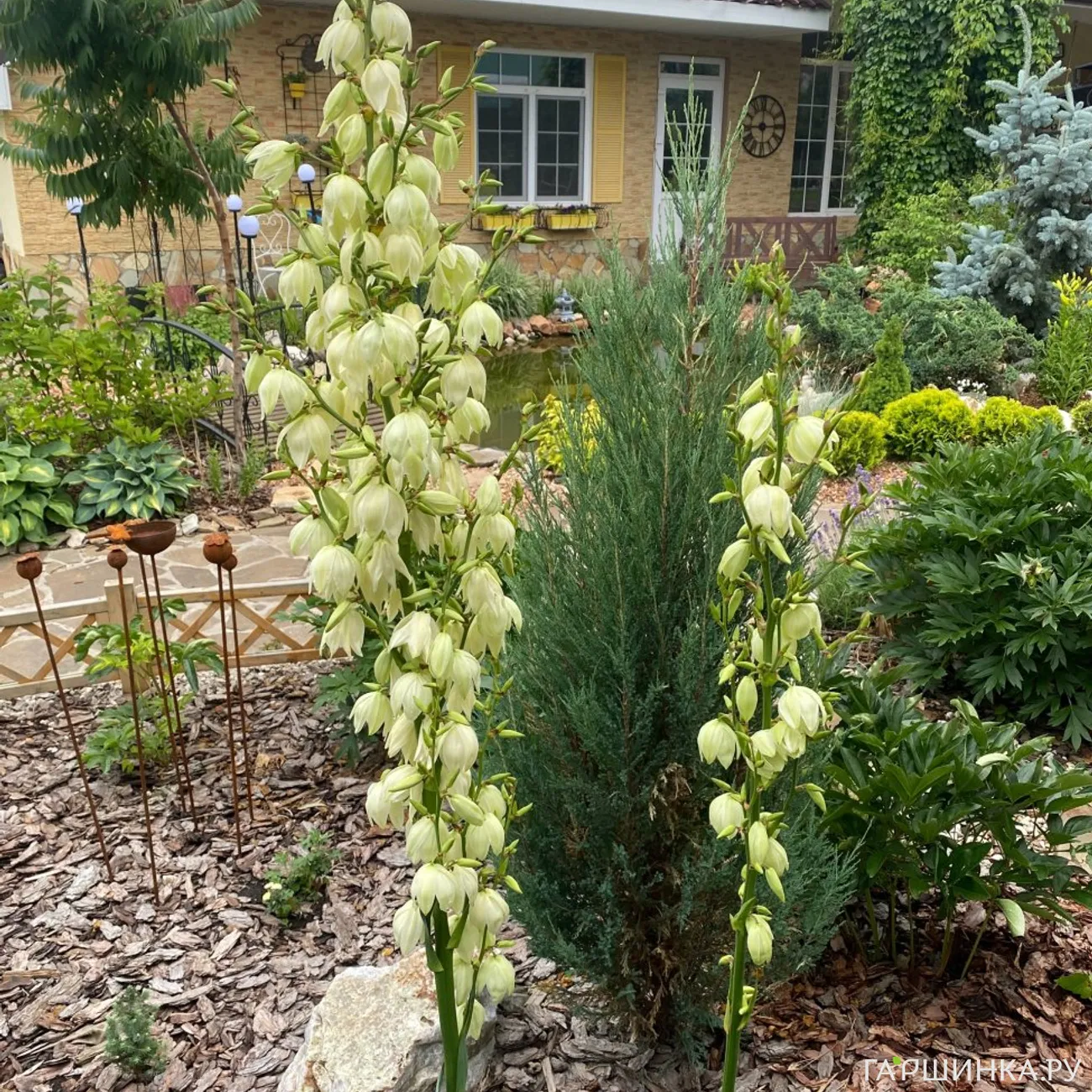 А ещё в этом году там и по всему участку поселилась семья зайчиков помогайчиков, Копайка вдохновляет к труду, Дзен медитирует, Кевин просто расслабляет, качаясь на сосне. А Серж это зайчик мужа, его так зовут и мы с ним с 1978 года вместе. Лягушки плавают в пруду, там тоже цветут нимфеи и лилии с кувшинками, а по берегу растет ирис жёлтый из Гаршинки.