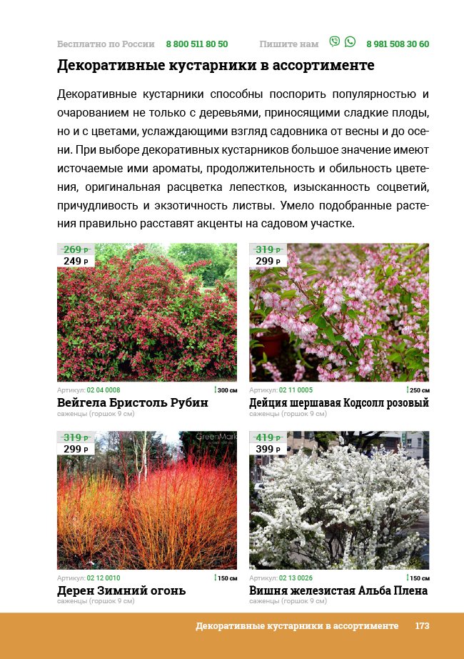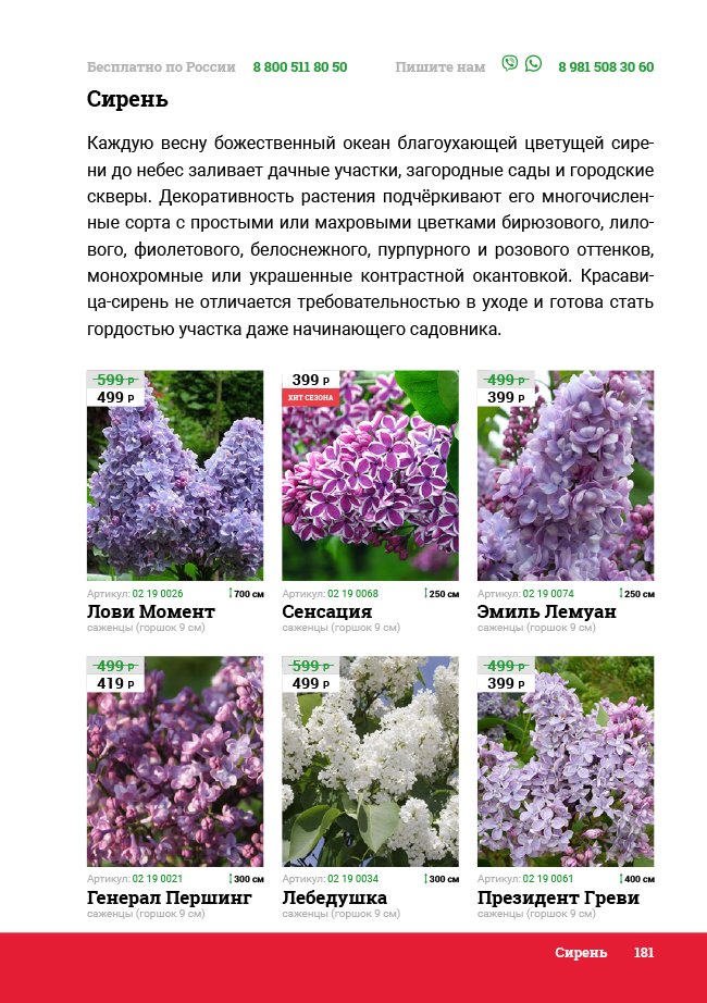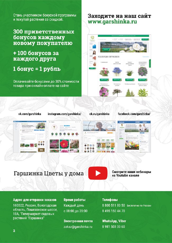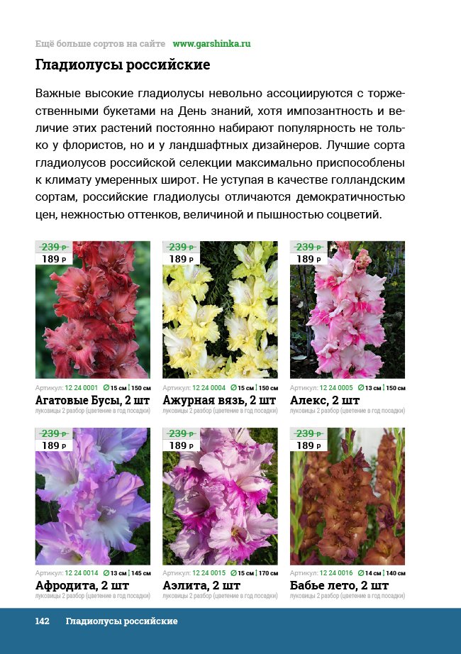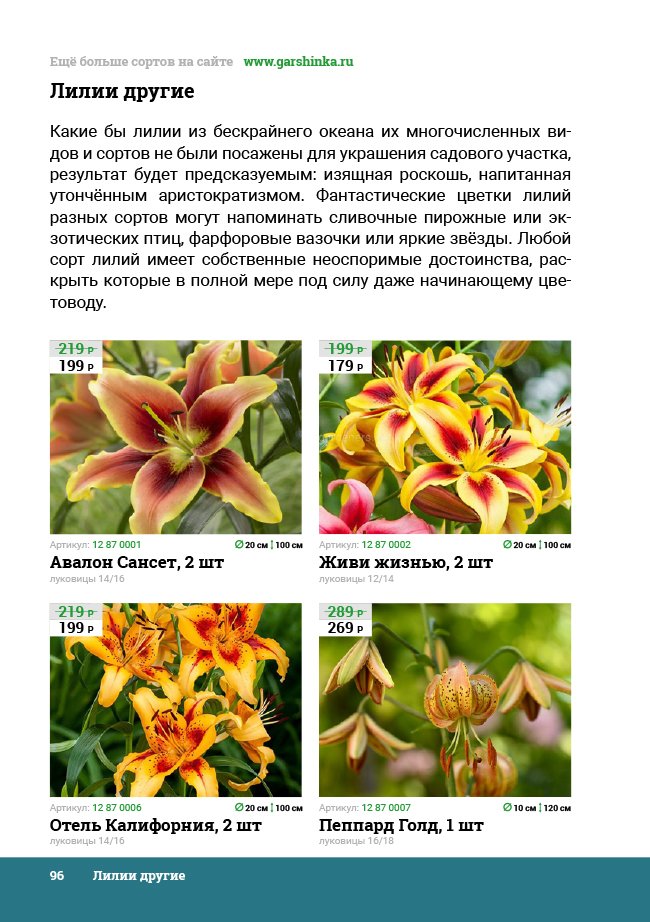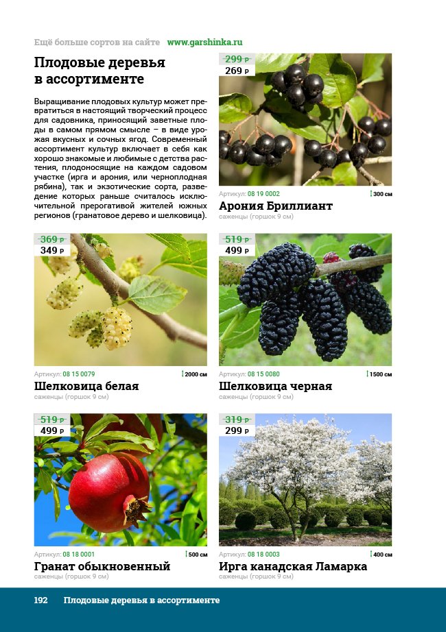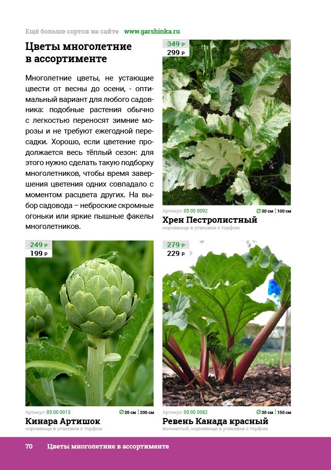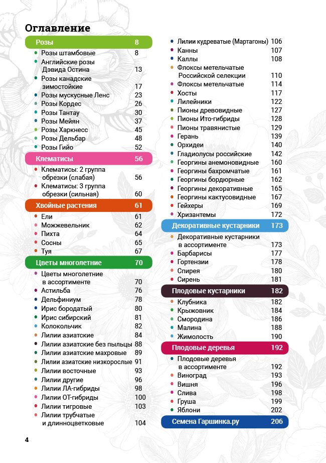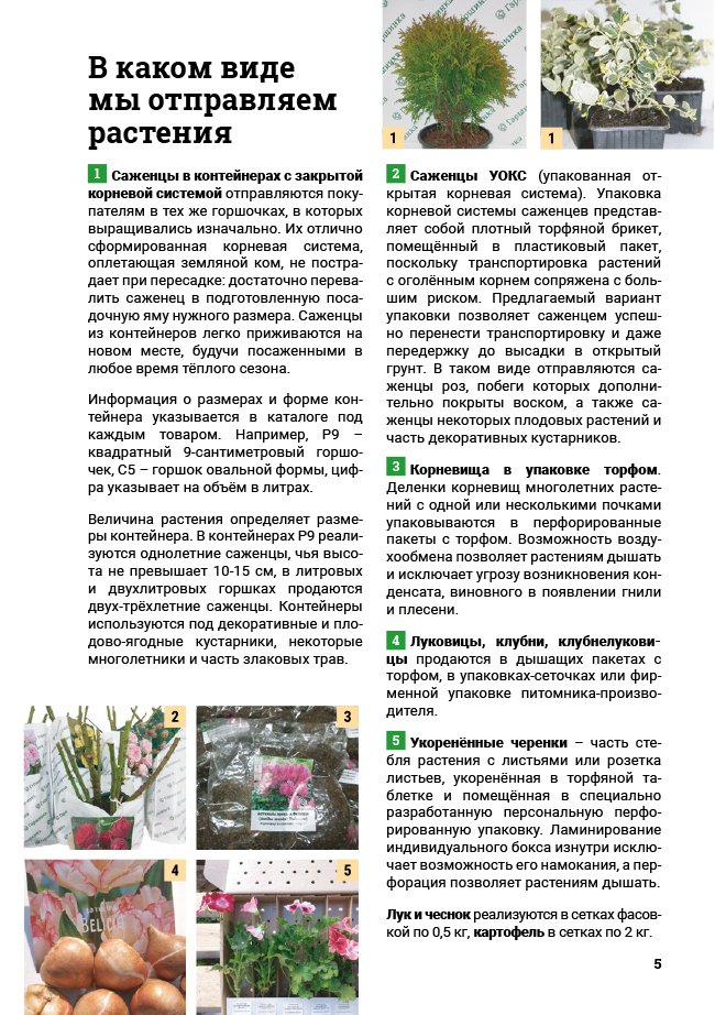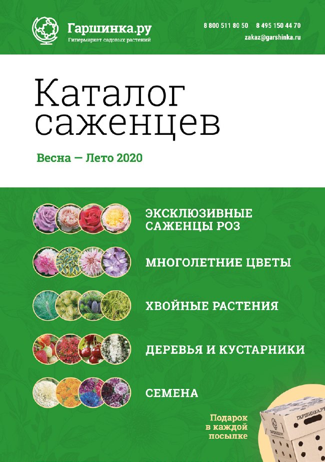 В новом универсальном и наиболее подробном каталоге мы представляем широкий ассортимент посевного и посадочного материала из отечественных и зарубежных питомников. Товарное предложение составлено только из высококачественных семян, эксклюзивных саженцев роз, плодовых и декоративных кустарников, хвойных растений, корневищных и луковичных многолетников, экзотических и любимых многими садоводами культур, способных придать любому возделываемому уголку облик нарядного цветущего сада.