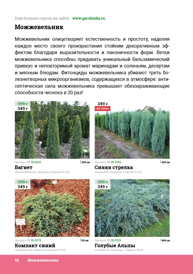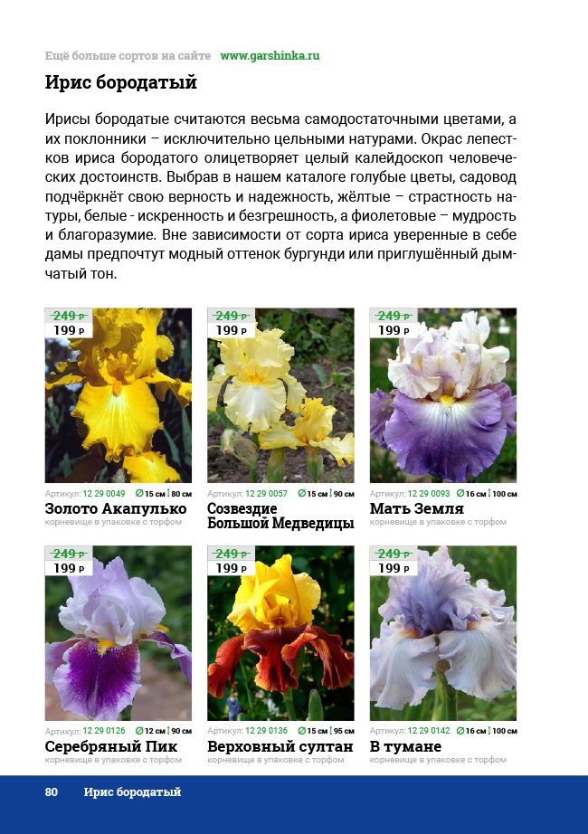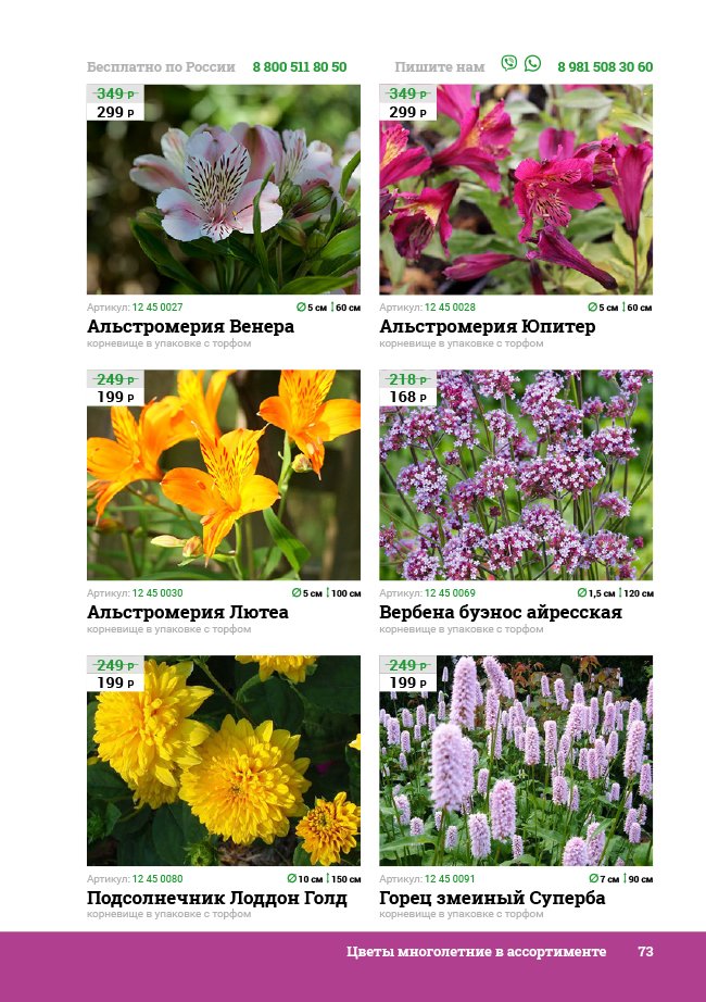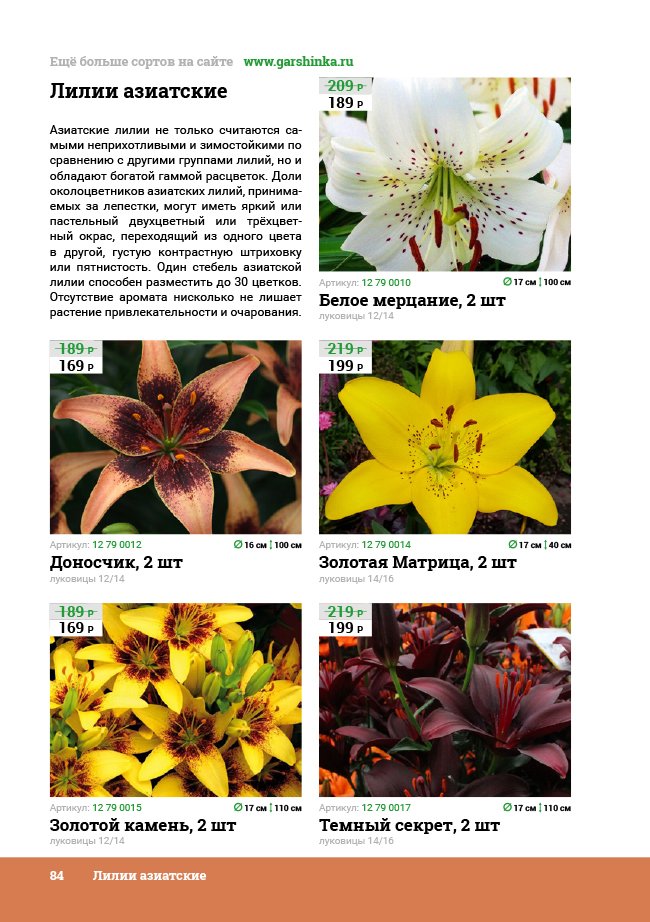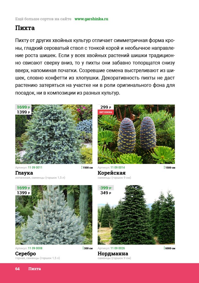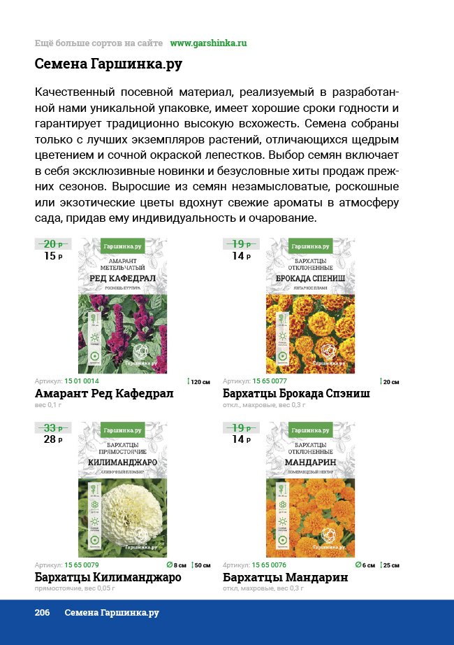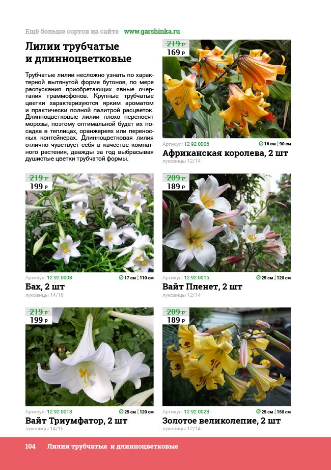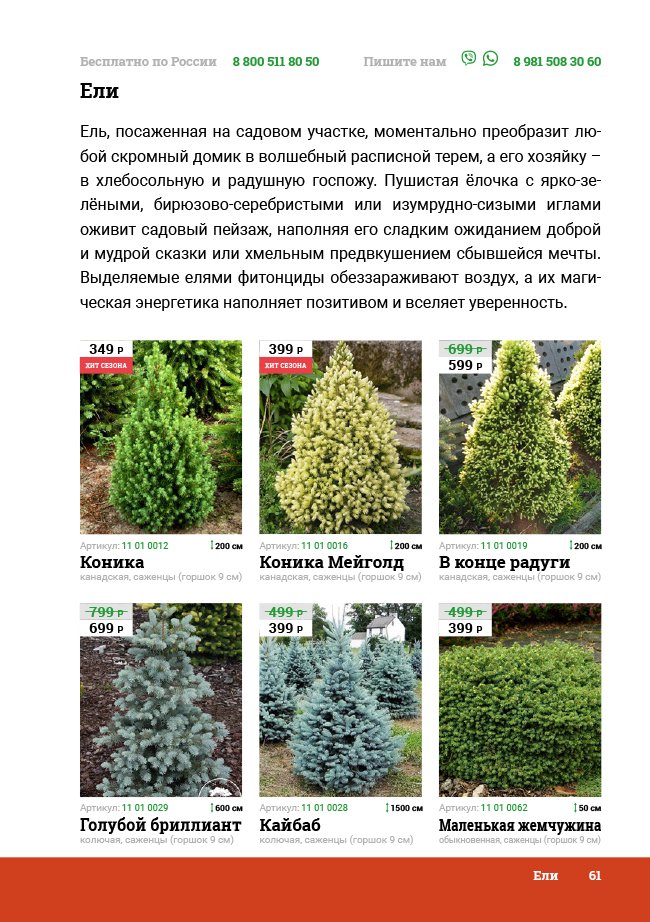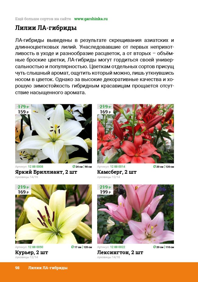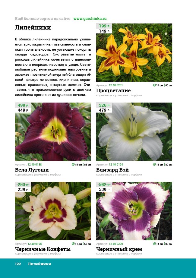 В новом универсальном и наиболее подробном каталоге мы представляем широкий ассортимент посевного и посадочного материала из отечественных и зарубежных питомников. Товарное предложение составлено только из высококачественных семян, эксклюзивных саженцев роз, плодовых и декоративных кустарников, хвойных растений, корневищных и луковичных многолетников, экзотических и любимых многими садоводами культур, способных придать любому возделываемому уголку облик нарядного цветущего сада.