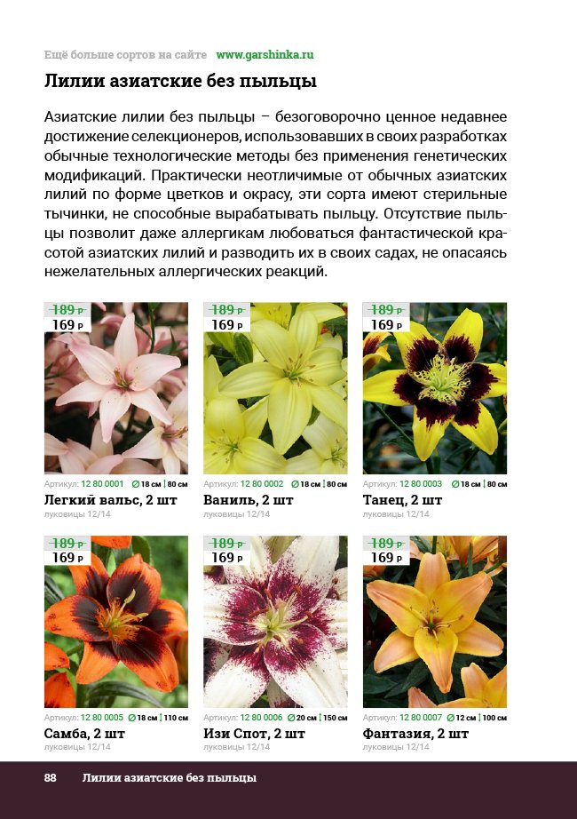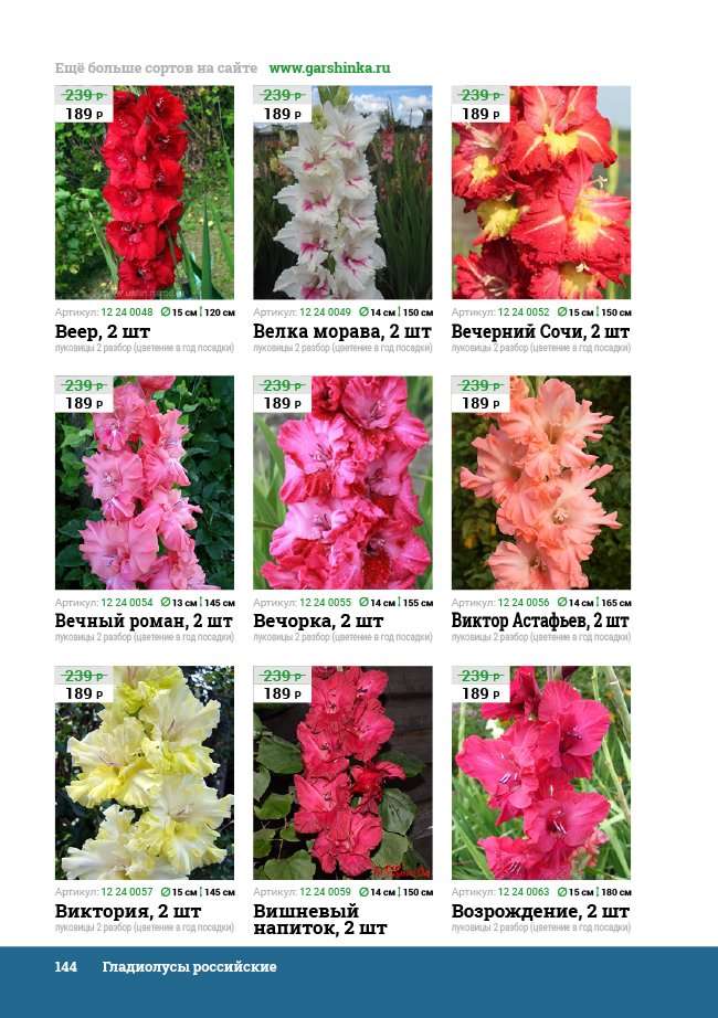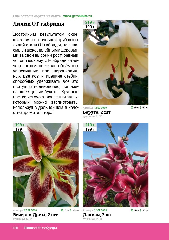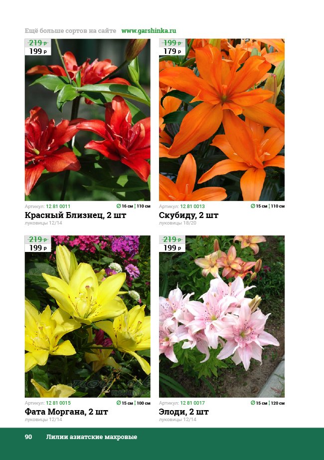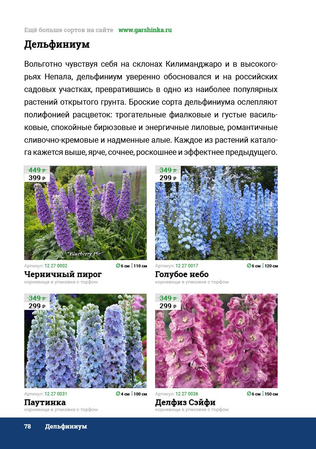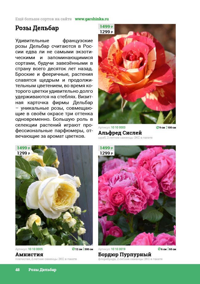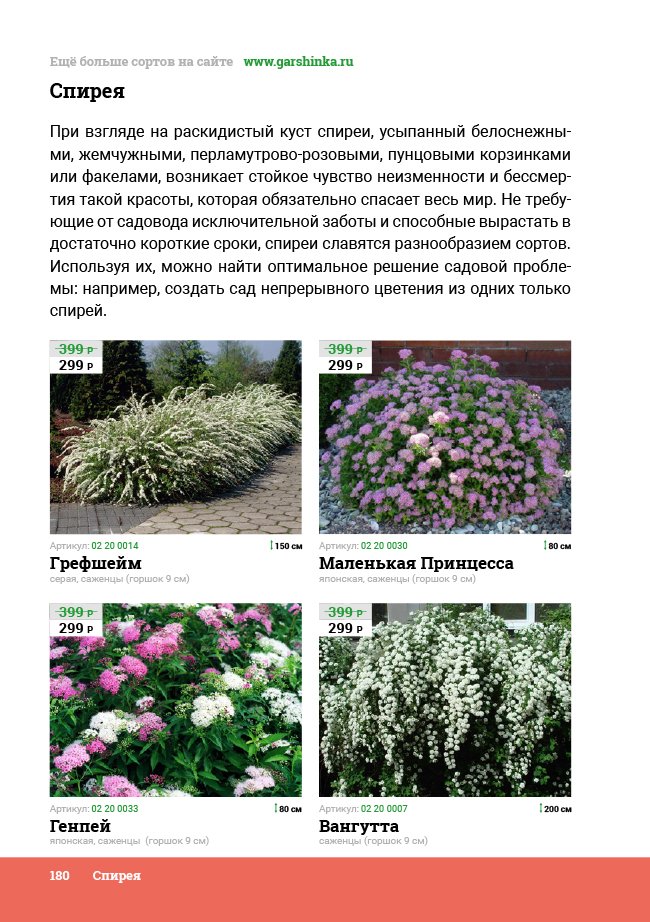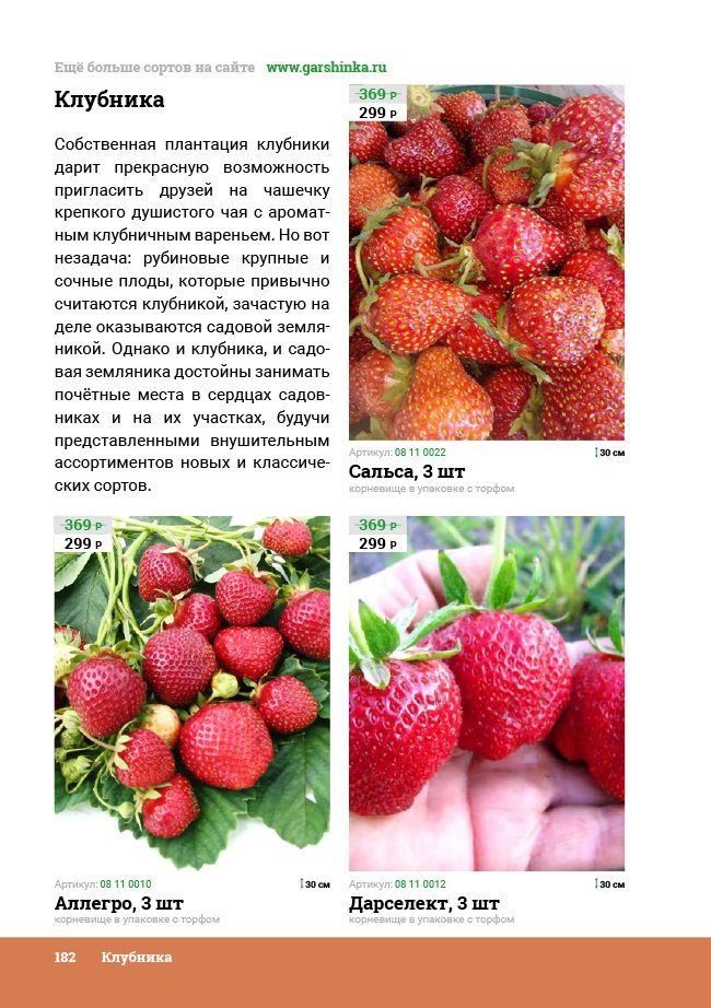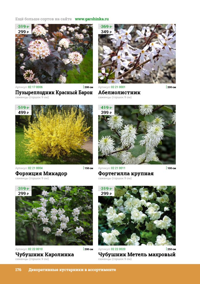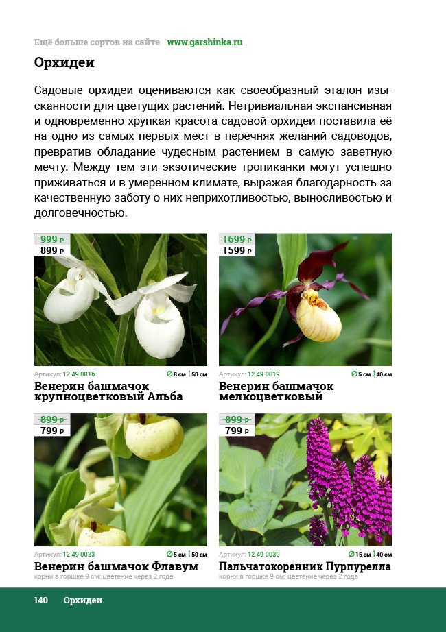 В новом универсальном и наиболее подробном каталоге мы представляем широкий ассортимент посевного и посадочного материала из отечественных и зарубежных питомников. Товарное предложение составлено только из высококачественных семян, эксклюзивных саженцев роз, плодовых и декоративных кустарников, хвойных растений, корневищных и луковичных многолетников, экзотических и любимых многими садоводами культур, способных придать любому возделываемому уголку облик нарядного цветущего сада.