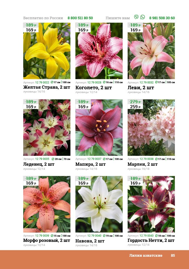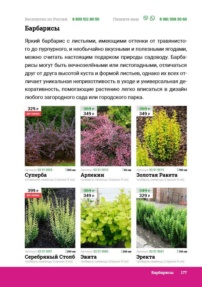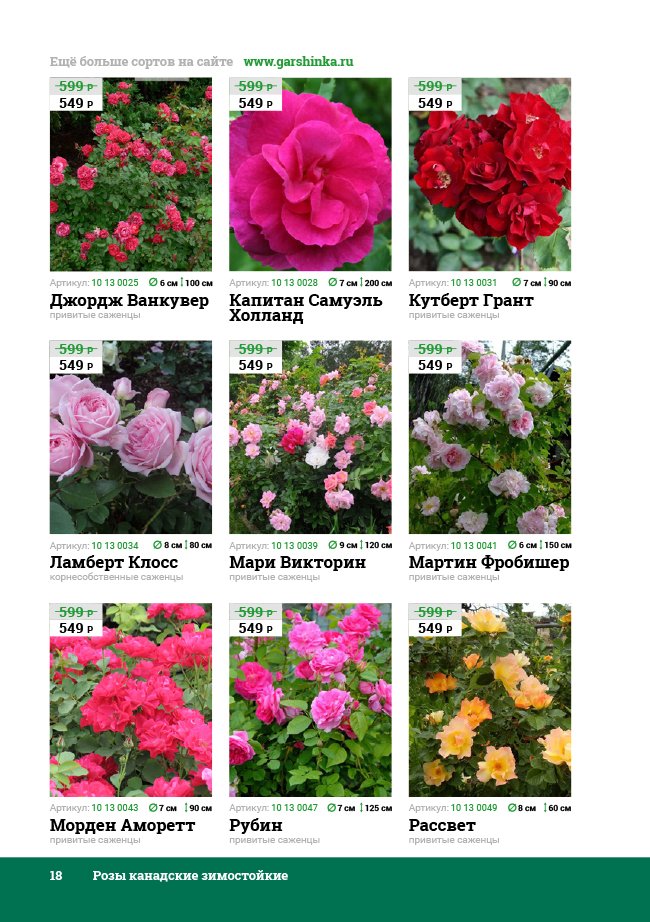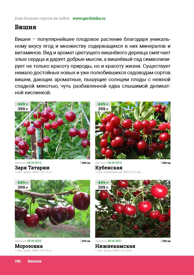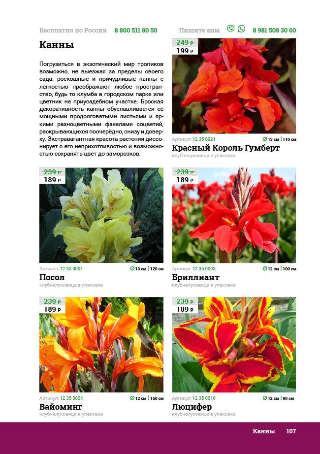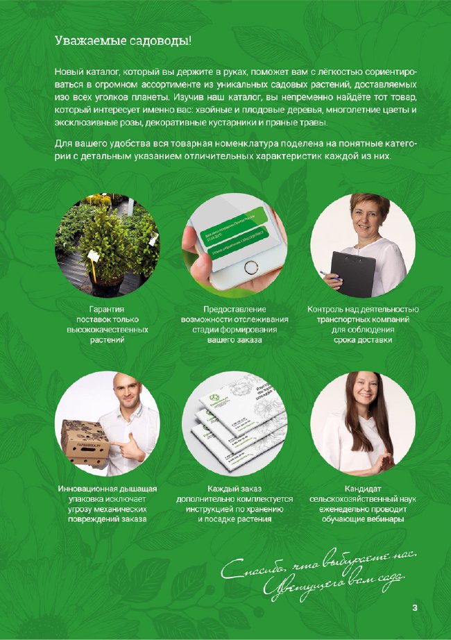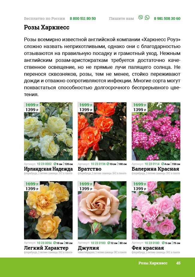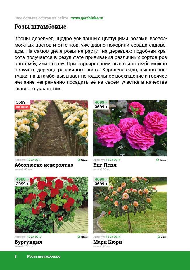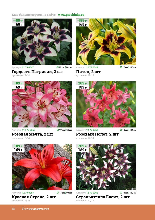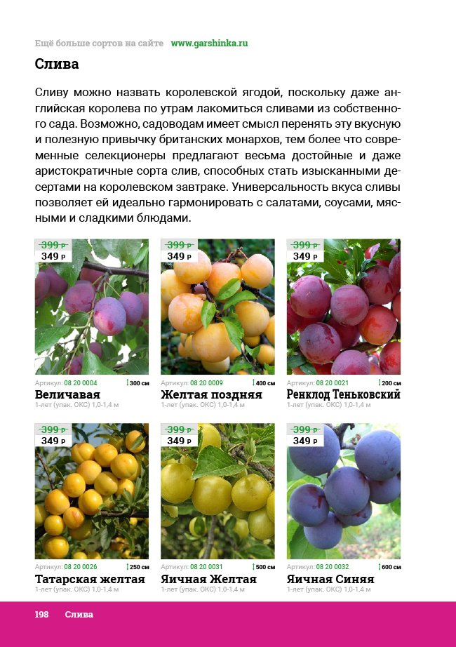 В новом универсальном и наиболее подробном каталоге мы представляем широкий ассортимент посевного и посадочного материала из отечественных и зарубежных питомников. Товарное предложение составлено только из высококачественных семян, эксклюзивных саженцев роз, плодовых и декоративных кустарников, хвойных растений, корневищных и луковичных многолетников, экзотических и любимых многими садоводами культур, способных придать любому возделываемому уголку облик нарядного цветущего сада.