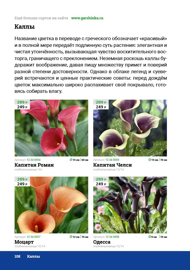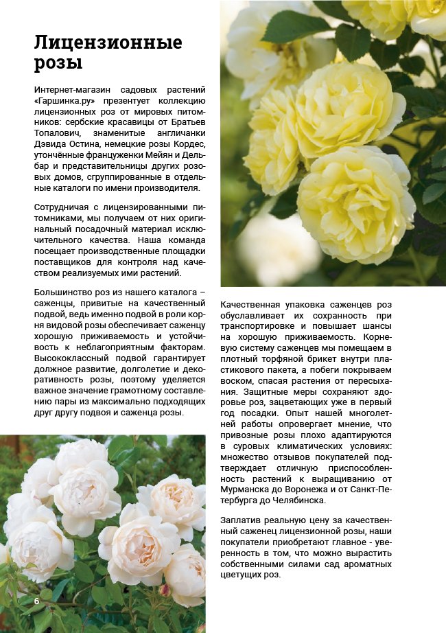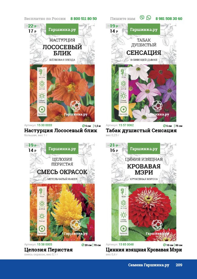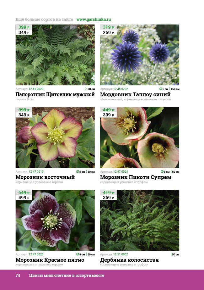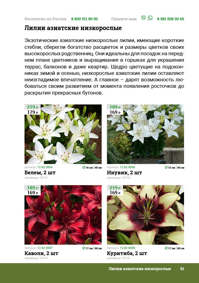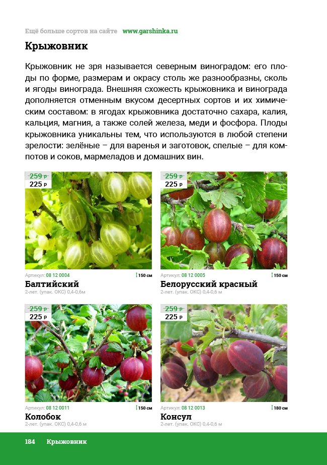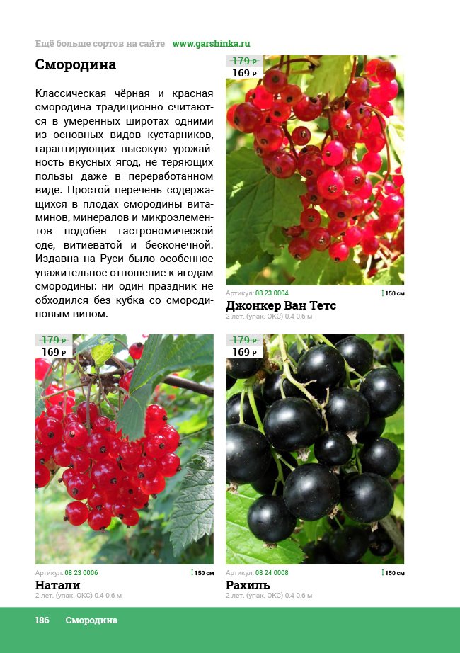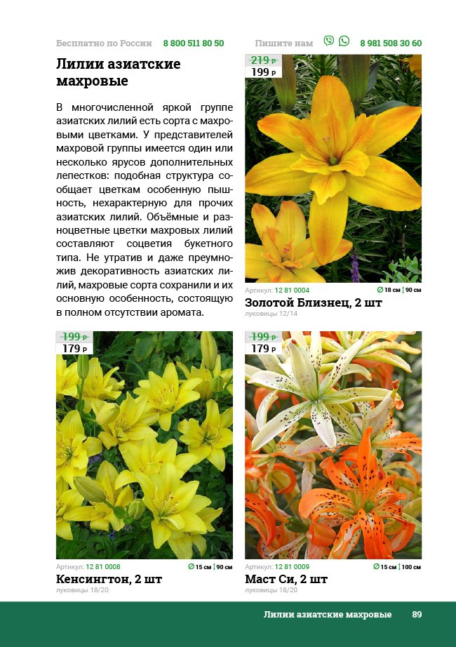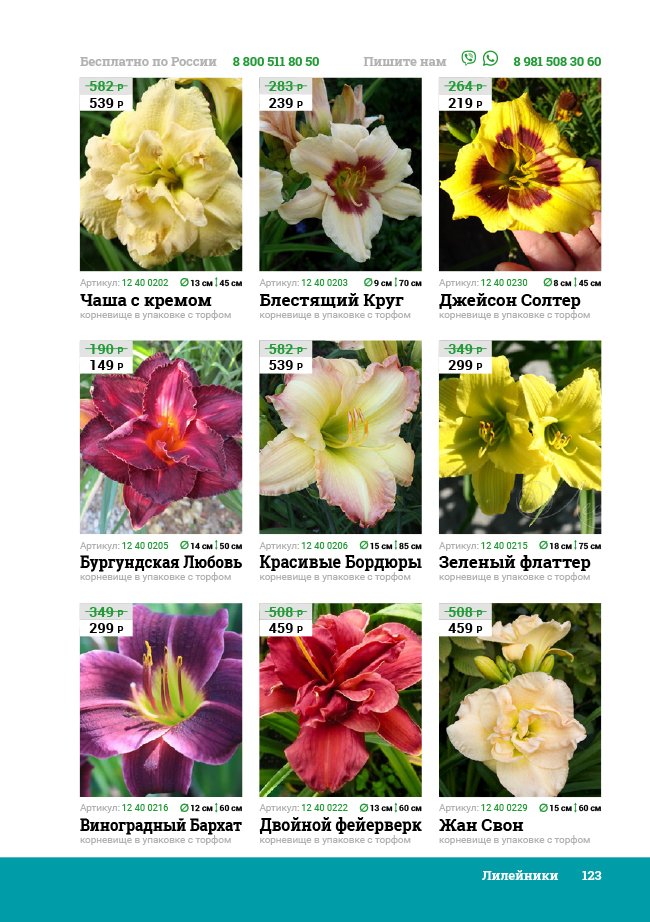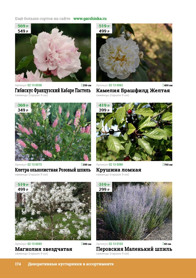 В новом универсальном и наиболее подробном каталоге мы представляем широкий ассортимент посевного и посадочного материала из отечественных и зарубежных питомников. Товарное предложение составлено только из высококачественных семян, эксклюзивных саженцев роз, плодовых и декоративных кустарников, хвойных растений, корневищных и луковичных многолетников, экзотических и любимых многими садоводами культур, способных придать любому возделываемому уголку облик нарядного цветущего сада.