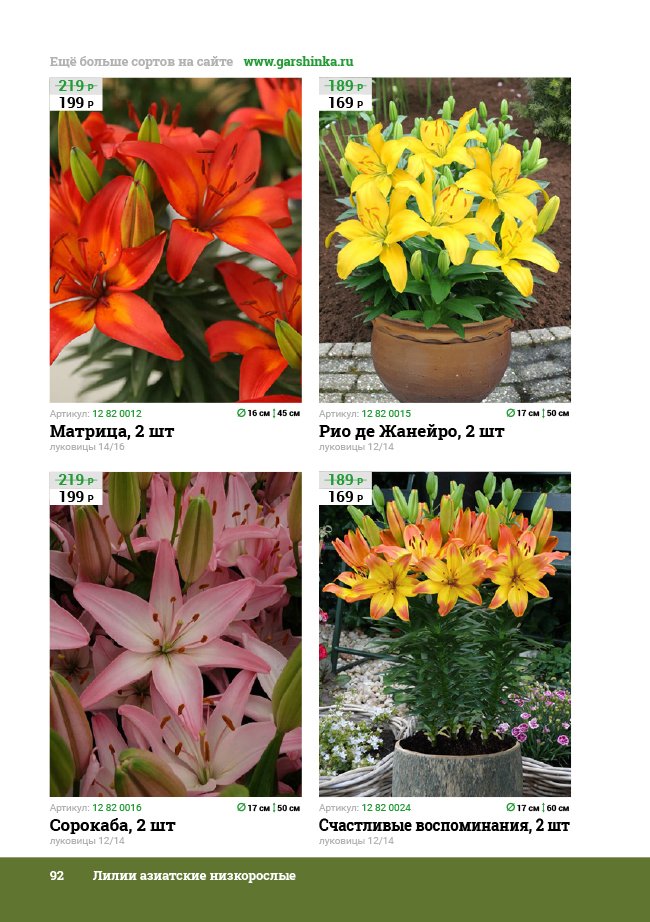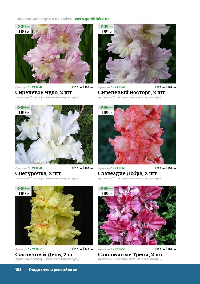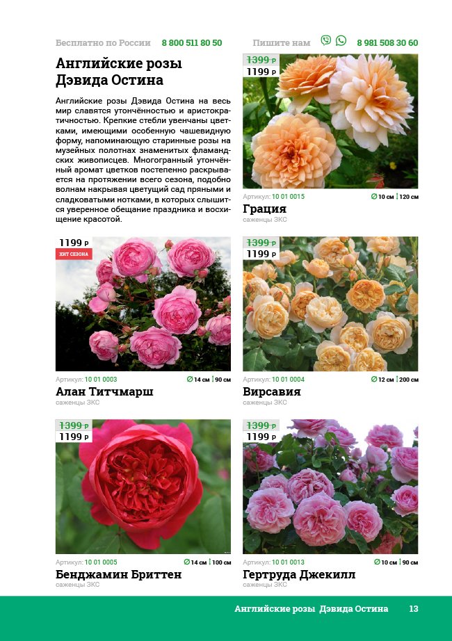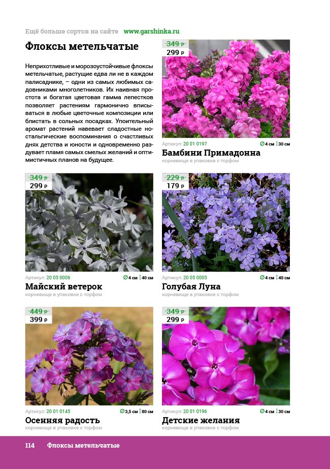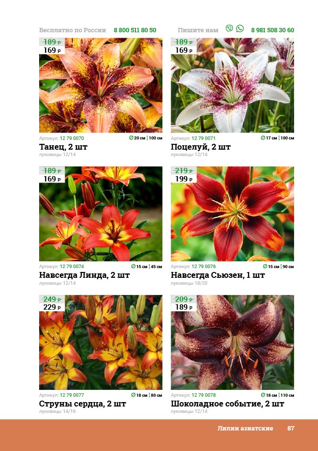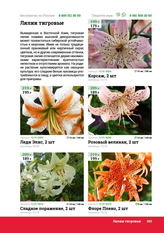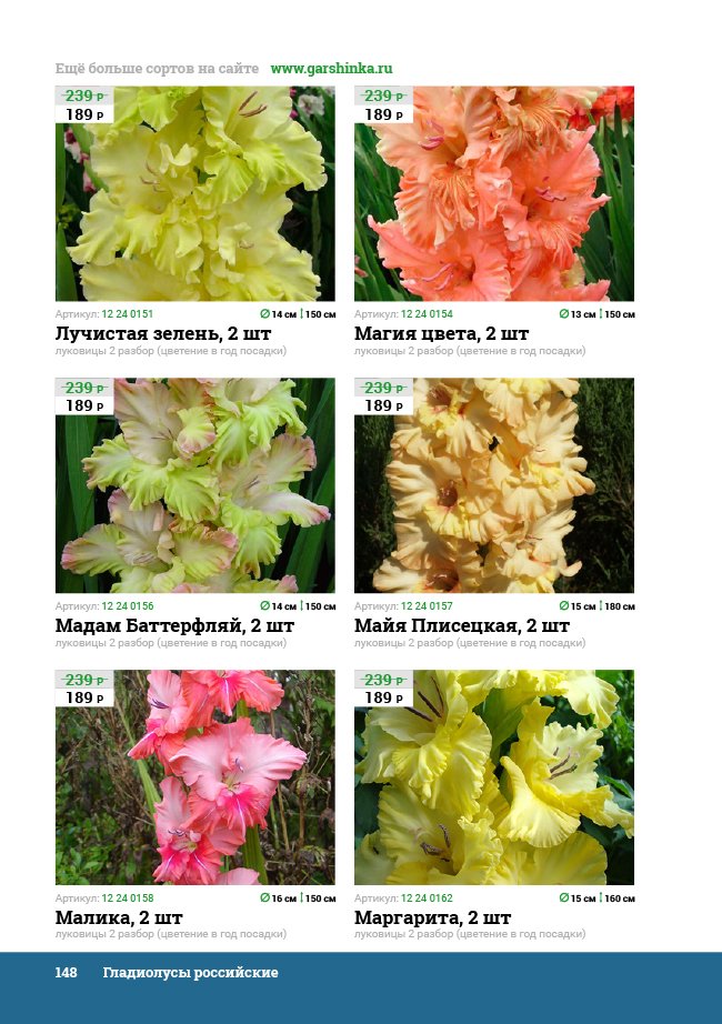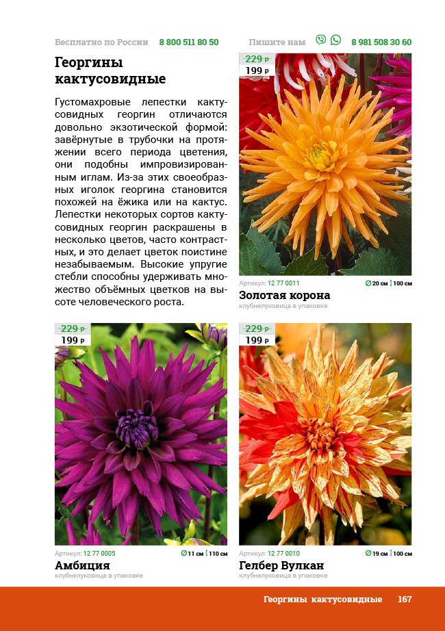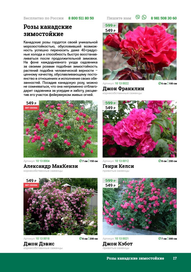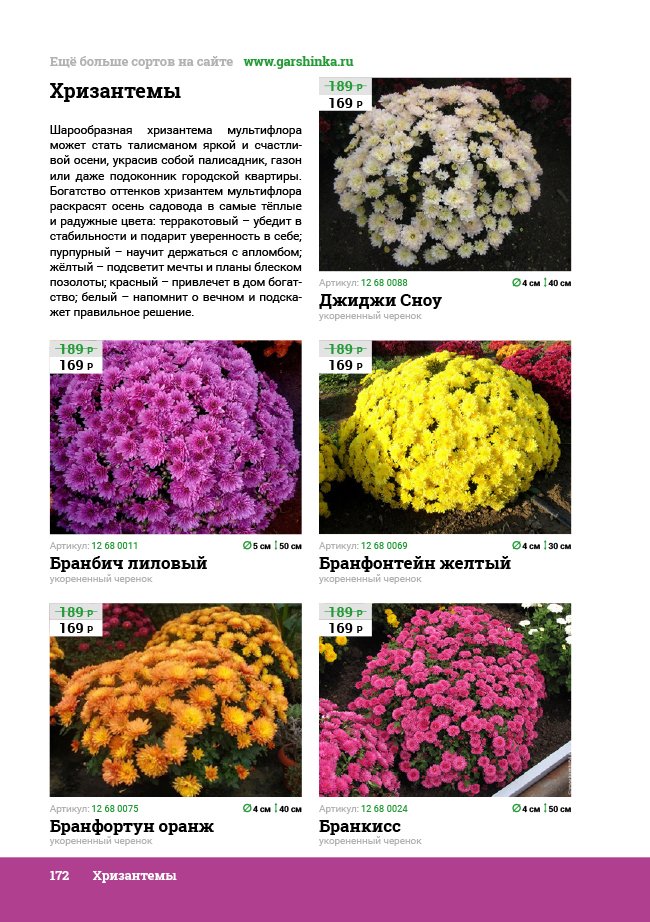 В новом универсальном и наиболее подробном каталоге мы представляем широкий ассортимент посевного и посадочного материала из отечественных и зарубежных питомников. Товарное предложение составлено только из высококачественных семян, эксклюзивных саженцев роз, плодовых и декоративных кустарников, хвойных растений, корневищных и луковичных многолетников, экзотических и любимых многими садоводами культур, способных придать любому возделываемому уголку облик нарядного цветущего сада.