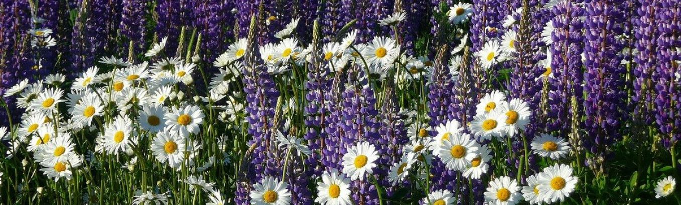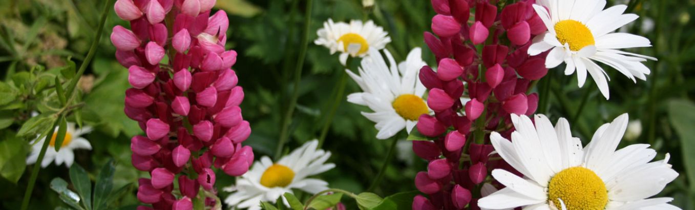 Георгины (пестрые) + ромашки + люпин – яркий летний микс.