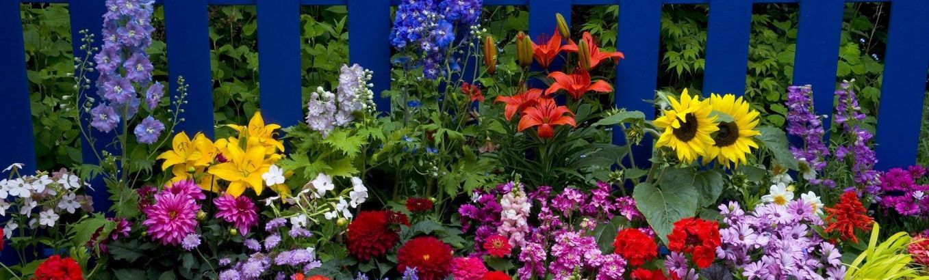 Георгины (бордовые/темно-оранжевые) + дельфиниумы (голубые/белые) + люпин – глубина и насыщенность против холодных свечек.