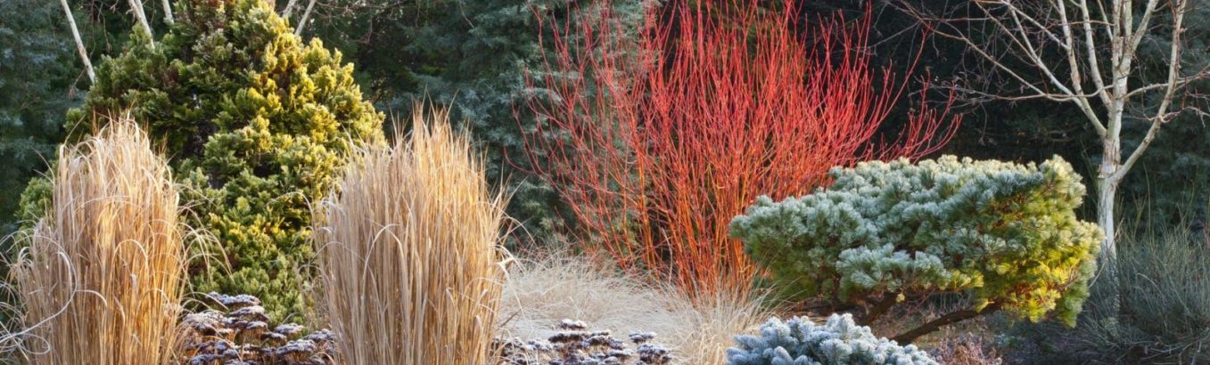 Подчеркнуть особенную декоративность сада, в котором зима полностью вступила в свои права, можно не только благодаря мощи и изысканности листопадных деревьев, чьи графичные силуэты чётко очерченными линиями выглядят на фоне бескрайних сугробов. Пышность и белоснежность зимнего одеяния сада отлично контрастирует с ярким и фактурным нарядом хвойников. Культуры с цветными побегами или блестящими бусинами плодов лягут в основу необычных колоритных композиций. Деревья и кустарники с причудливо изогнутыми ветвями или необычной формой кроны привлекут особое внимание, будучи припорошенными искрящимся снегом. Шёпот засохших соцветий декоративных трав отвлечёт от заунывной песни сквозняков.