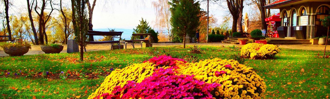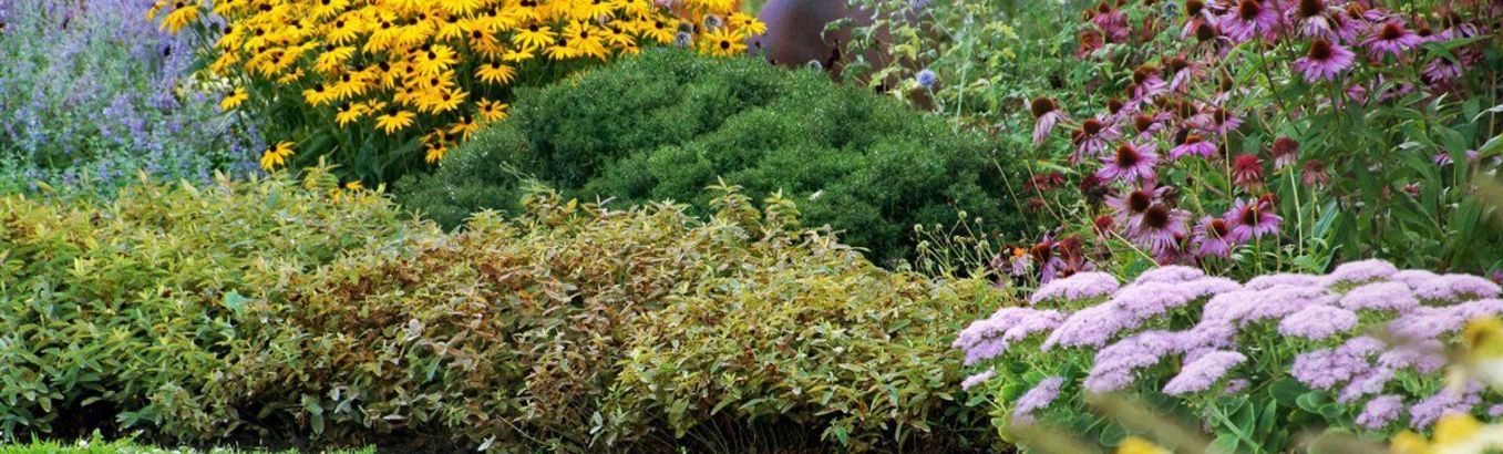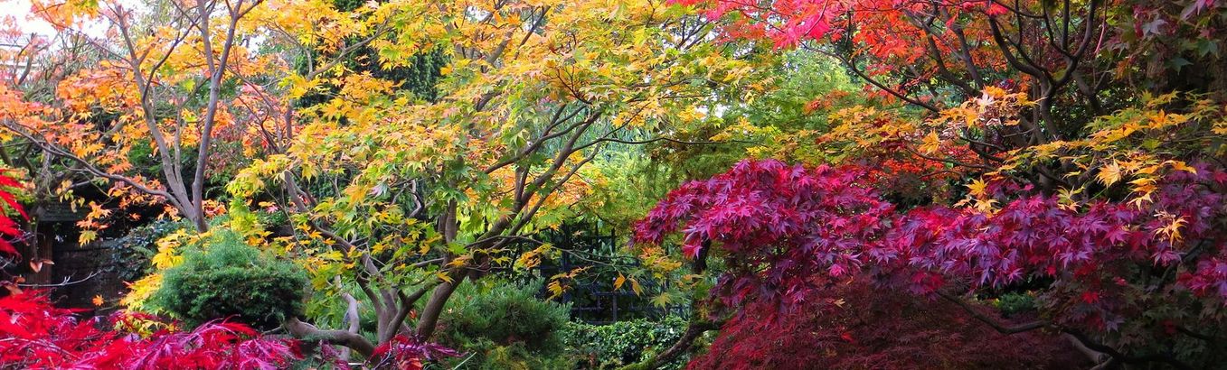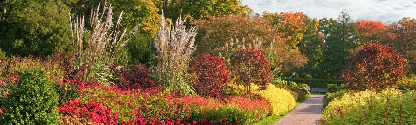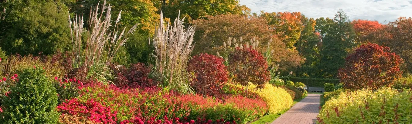 Декоративные кустарники, сменившие однотонное зелёное летнее платье на пёстрые осенние костюмы, хвалятся золотисто-жёлтыми оттенками листвы, переходящими в пунцово-лососевые или медно-апельсиновые тона.
