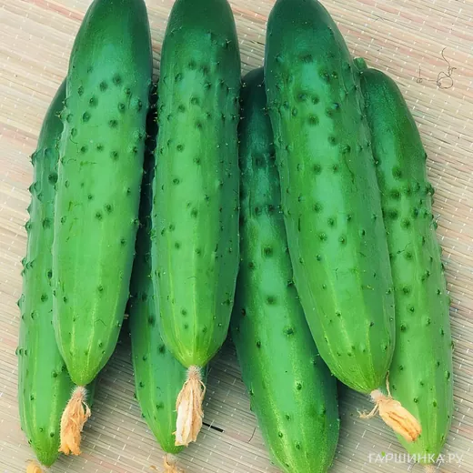 Зеленцы удлинённые, массой от 110 до 160 г, длиной 14–24 см, с тонкой кожицей и белыми шипами. Мякоть сочная, плотная, хрустящая. Гибрид особенно хорош для свежих салатов, а для засолки и маринования плоды собирают, пока они находятся на ранней стадии созревания — так огурчики сохраняют форму и характерный хруст.