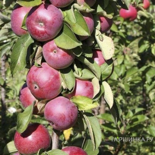 Яблоня Есения колоновидная - осенний сорт, устойчив к холодам. Высота 2.5 м, ширина 0,6 м, ствол плотный, рост вертикальный, боковые ветви почти не формирует, мощная развитая корневая система, лист ярко-зеленый. Плод округло-вытянутый, темно-красный, с красно-сизым румянцем на боку, 200 гр, мякоть зеленовато-белая, вкус кисло-сладкий, грушевый, сочный, присутствует приятный аромат, десертный. На одном дереве созревает очень много плодов, плодоношение ежегодное, первое в год посадки. Товарность и транспортировка высокая, лежкость до декабря-января.