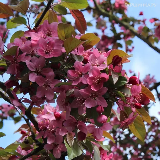Яблоня Роялти декоративная - высота – 3-4 метра, крона раскидистая, шарообразная или полуовальная. Без ухода и формирующей обрезки высота яблони может достигать 6 метров, а диаметр кроны – 4-5 метров. Дерево хорошо облиствено, лист крупный (8-12 см), в форме эллипса, с заостренным носиком. Поверхность листовой пластины слегка опушенная, глянцевая, с хорошо вычерченными прожилками и мелкопильчатой окантовкой. Окрас листьев варьируется от темно-зеленого до пурпурного и багряного (к осеннему сезону). В период цветения покрывается многочисленными крупными бутонами, достигающими в диаметре до 3,5 см. Цветы насыщенно розовые, почти малиновые, очень ароматные. Лепестки овальные, в количестве пяти штук, распускаясь открывают тычинки на длинных ножках. Сам цветок держится на тонком, белесом цветоносе. Плоды выглядят, как мелкие продолговатые ягодки (5-6 г), темно-красные, с антоциановым пруином, крепятся на длинной плодоножке, появляются в середине сентября. Яблоня Роялти – сорт декоративный и ее плоды несъедобные! Зона морозостойкости - 4.