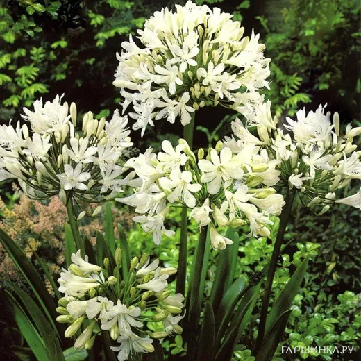 Агапантус Вайт - травянистый многолетник дико произрастающий на территории Южной Африки вдоль морского побережья и по сухим склонам. Растение имеет толстый мясистый корень. Листья агапантуса длинные прикорневые, собранные в розетки. Во время цветения растение выбрасывает цветонос до 70 см с большим количеством белых цветков, собранных в соцветие-зонтик. Раскрываются цветки постепенно, поэтому цветение может продолжаться до двух месяцев.
