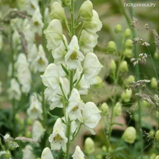 Аконит (Борец клобучковый) Альбум - формирующий крепкий куст, высота прочных побегов достигает 1 м, диаметр около 80 см, листья рассеченные, темно-зеленые. Цветет обильно с июля до конца сентября, цветы шлемовидные, белые, диаметром около 3 см. Купить саженцы аконита клобучкового Альбум стоит для украшения заднего плана цветников, миксбордеров, зон отдыха, садовых дорожек, декорирования оград и стен построек, сорт красиво выглядит в одиночной посадке и в составе растительной композиции, он удачно сочетается с дельфиниумами, астильбами, рудбекией, флоксами, лилейниками, тысячелистником, цветы аконита подходят для срезки. Растение морозостойко, неприхотливо, устойчиво к заболеваниям и насекомым-вредителям.