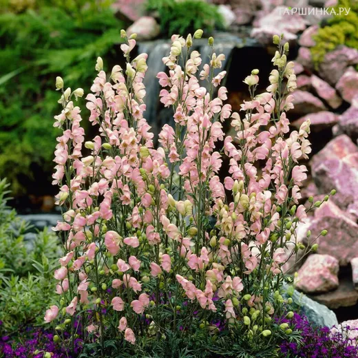 Аконит (Борец клобучковый) Рубеллум - травянистый многолетник. Куст прямостоячий, растет быстро, высота 100 см, побеги прямые, прочные. Лист пальчато-рассеченный, темно-зеленый. Соцветие метелка, цветки шлемообразные, окраска розовая.