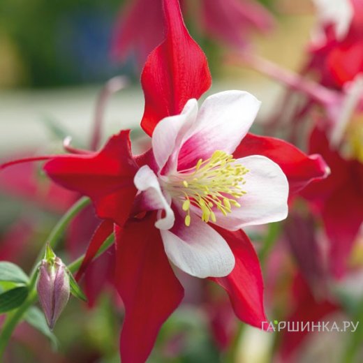 Аквилегия Swan Red + White - обильно цветущий сорт с крупными красно-белыми цветками. Цветки аквилегии имеют ярко-алые чашелистики, которые отлично сочетаются с белыми лепестками и ярко-желтыми тычинками. Куст хорошо разветвлен, высота 50-60 см.