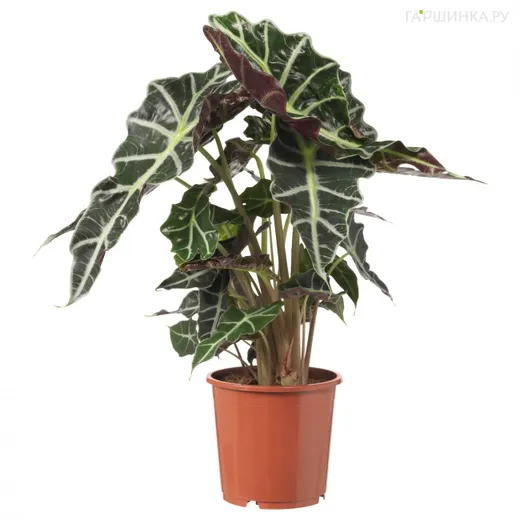 Алоказия Амазоника - имеет необычайно красивые крупные листья. Они отличаются вытянутой стреловидной формой и металлическим блеском. Темно-зеленые листья располагаются на длинных черешках и имеют крупные белые прожилки и ярко выраженные доли. Размер листьев: ширина – 20 см., длина – 40-50 см. Стебель растения – пятнадцать сантиметров в длину, что позволяет размещать этот цветок даже в небольших цветочных композициях в интерьере. Корень растения представляет клубень, от которого образуются отростки.