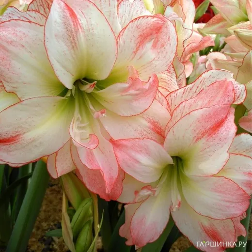 Амариллис Афродита - "Сказочная нимфа". Цветонос 45-80 см, содержит 4-12 цветков. Цветок махровый, окраска белая, с красной окантовкой, диаметр 15-25 см.