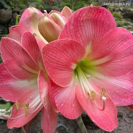 Гиппеаструм Сюсан - "Сказочная нимфа". Цветонос 45-80 см, содержит 4-12 цветков. Цветок воронковидный, трубчатый, немахровый, розовая, центр белый, диаметр 15-25 см.