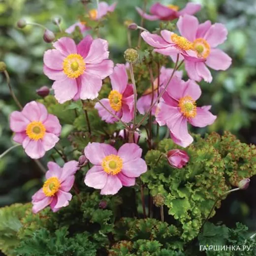 Анемона (Ветреница) японская Криспа - растение высотой около 80 см. Цветки розовые, с множеством золотистых тычинок в центре, собраны по 10-15 шт. в соцветии. Цветет обильно, но больше примечательна салатовыми гофрированными листьями.