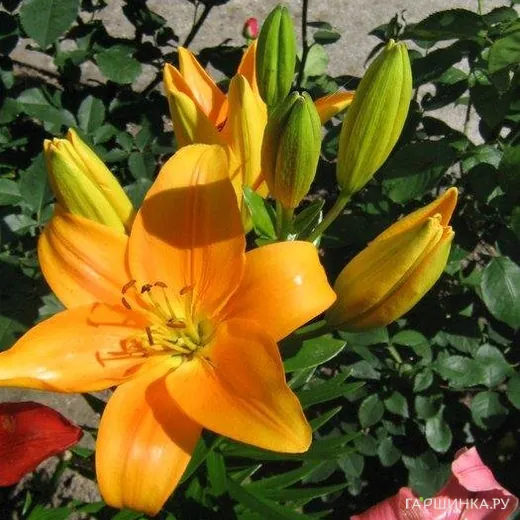 Лилия Антекера азиатская/2шт - Цветки лилии крупные с широкими овальными лепестками околоцветника; фактура плотная; направлены в стороны и вверх. Окраска яркая, желто-оранжевая, с более светлыми кончиками лепестков и штучным крапом в горле. Высота растения 110-120 см. Цветки лилии 19 см в диаметре. Нежный аромат. Период цветения июль.