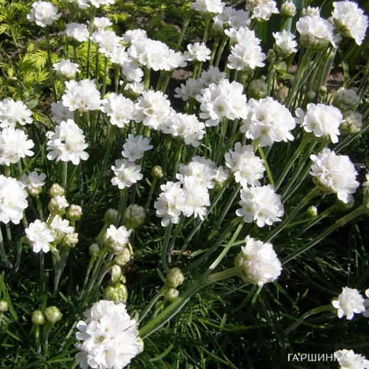 Армерия приморская Альба - многолетнее подушковидное растение 15 см в поперечнике и высотой 15-20 см, с узкими, линейными, плоскими, тупыми сине-зелеными листьями. Цветоносы до 20 см высотой, опушенные. Цветет с мая около 70 дней, иногда повторно осенью. Цветки белые.