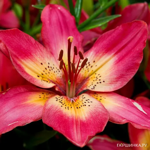 Лилия Арсенал азиатская /2шт - Цветок крупный, ярко-розового цвета с жёлтым центром и редким тёмным крапом. Высота растения 120 см. Цветки лилии 17 см в диаметре. Нежный аромат. Период цветения июнь-июль.