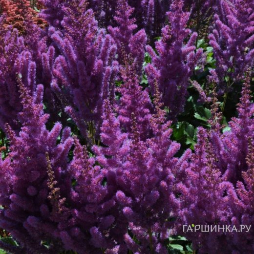 Высота у данного вида астильб средняя, равняется примерно 70 см, диаметр при этом – 50 см. Корневая система прочная, поэтому культура совершенно не боится ветров. Соцветия у астильбы весьма крупные, длинные (от 30 до 35 см в высоту) и пушистые. По внешнему виду напоминают метелки. Цвет их фиолетовый, как уже упоминалось, самый темный из всех имеющихся астильб. Цветки, образующие соцветия, маленькие, уложены плотно.