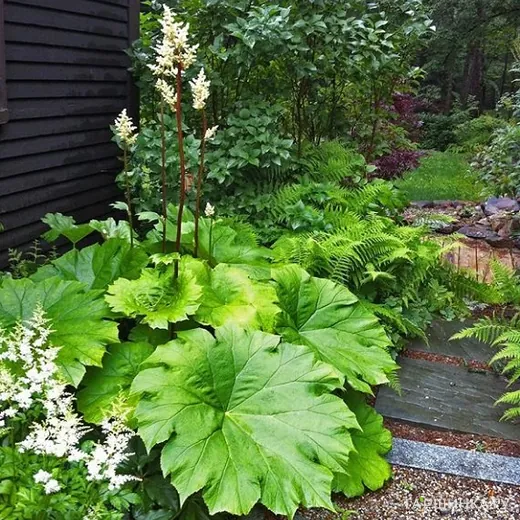 Астильбоидес пластинчатый - многолетнее декоративно-лиственное растение с крупными цельными листьями с лопастями и мелкими зубчиками по краю. Цветет в июле белыми цветками, собранными в метельчатые соцветия. В полном развитии листья достигают 60-80 см в диаметре, а черешки - до 80 см в высоту. Цветонос до 150 см. Цветет в июле.