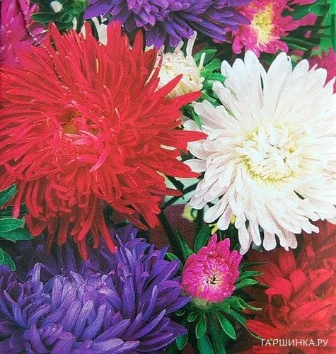 Астра Американская красавица, смесь окрасок, Лидер - Куст широкораскидистый, высотой до 70 см. Соцветия полусферические или почти шаровидной формы, махровые, похожи на пионовидные, 9-10 см в диаметре. Лепестки язычковых цветков ладьевидные, слегка загнуты внутрь соцветия. Превосходно подходит для срезки, долго стоят в букетах.