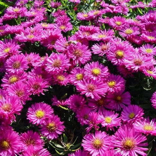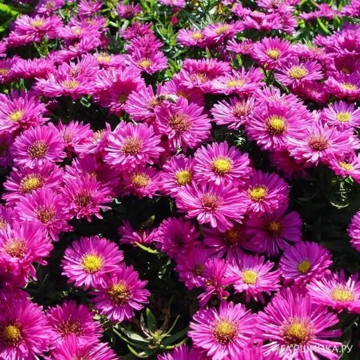 Астра кустарниковая Старлайт – многолетнее травянистое растение. Высота растения всего 40-50 см. Цветет с конца августа по сентябрь. Листья темно-зеленые, заостренные. Цветки небольшие, в диаметре до 3 см, оттенок от фиолетово-розового до ярко-малинового, с ярко-жёлтым диском.