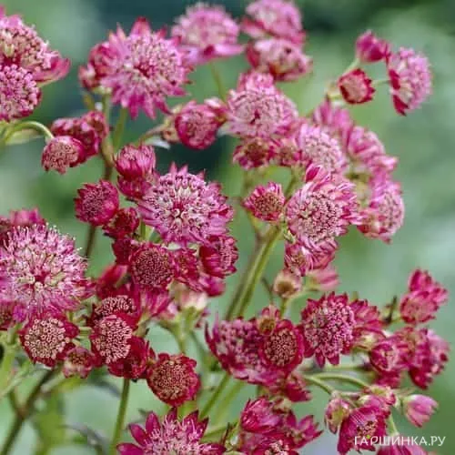 Астранция Ларс крупная – корневищный неприхотливый многолетник. Высота до 60 см. Цветки необыкновенно эффектные, крупные, розовые, собраны в простые зонтики, с яркими прицветниками темно - розового цвета на длинных прямостоячих цветоносах. Цветет в июне - сентябре.