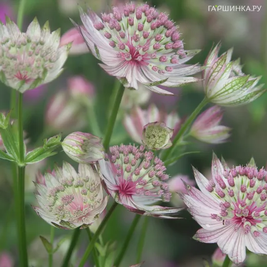 Астранция Бакленд – корневищный неприхотливый многолетник. Высота 60 см, диаметр цветка 4 см. Крупный сорт с мелкими махровыми цветками, которые постепенно меняют оттенок от белого до розового. Кусты пышные, сильно разветленные. Характер роста побегов: прямостоячие.