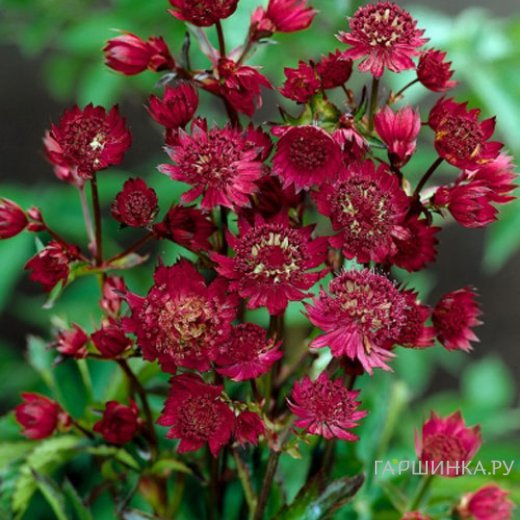 Астранция Руби Веддинг – корневищный неприхотливый многолетник. Высота около 70 см. Цветки звездообразной формы, темно-рубиново-красные и диаметром 3,5 - 5 см.  Цветет  июнь — август.