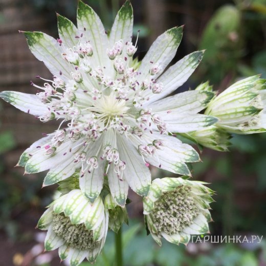 Астранция Шегги - высота растения 75 см. Цветок белый с зеленым оттенком. Астранция крупная - в период цветения кусты раскидистые. Листья трех-семираздельные, на длинных черешках, собраны в прикорневую розетку. Цветки бледно-розовые, в простых зонтиках диаметром 3,5-5 см. Листочки обертки зеленые или бледно-розовые. Цветет в июне — августе 35-40 дней.