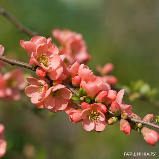 Айва Салмон Горизон — это декоративное растение, которое привлекает внимание своими уникальными ботаническими свойствами и эстетическими качествами. Это многолетний кустарник, который отличается компактной формой и умеренным ростом. Взрослое растение достигает высоты до 1,5 метров, что делает его идеальным выбором для создания живых изгородей или декоративных композиций в саду. Айва Салмон Горизон обладает густыми побегами с небольшими шипами, что придает растению дополнительную защиту и декоративность.