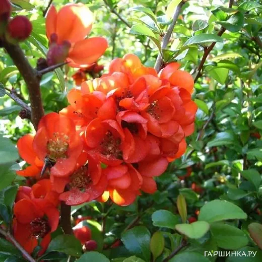 Продавец: ИНН 350902477384Айва японская Саржента - невысокий раскидистый кустарник, яркоцветущий в середине весны. Ветви дугообразные, несколько наклонные, с колючками и с частично стелющимися побегами. Высота взрослого растения 0,5-1 м, диаметр кроны 1-1,4 м. Молодые побеги вначале зеленые, опушенные, затем коричнево-серые. Листья продолговатые, темно-зеленые, блестящие летом, желтые - осенью. Цветы ярко-оранжевые, медоносные, собраны в соцветия по 2-6 штук, до 3 см. в диаметре, цветет до появления листьев, в апреле-мае. Плоды до 5 см. в диаметре, шаровидные, съедобные, с запахом зеленых яблок, по мере созревания (сентябрь-октябрь) желтеют.
