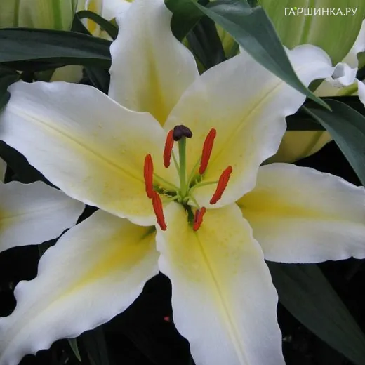 Лилия Баферрари восточная белая - Цветки крупные, хороший аромат. Высота 120-130 см. Стебли растения крепкие, прямостоячие, покрыты цельными, поочередно расположенными темно-зелеными листьями. Цветки крупные (до 15 см в диаметре), повернуты в стороны, окрашены в белый цвет с желтой полосой по центру.