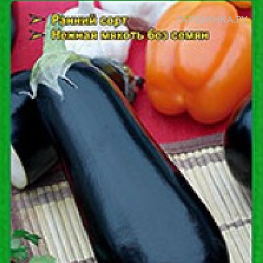 Среднеранний урожайный сорт, вступает в плодоношение на 80-й день после пересадки 45-ти дневной рассады. Куст среднерослый, раскидистый, высотой до 75 см в открытом грунте и до 110 см в парниках. Шипы на растении очень редкие. Плоды цилиндрической формы, ровные, массой 250-350 грамм, размером 5х25 см. Очень красивые, блестящие, темно-фиолетовой окраски, с белой мякотью без горечи и малым количеством семян, которые расположены только в верхней части плода. Для сорта характерно дружное и продолжительное плодообразование. Растение предназначено для выращивания как в защищенном грунте (все типы парников и теплиц), так и в открытом..