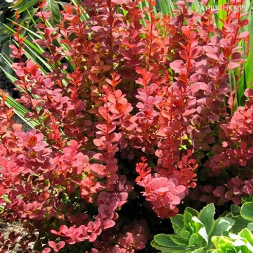 Барбарис Тунберга Ред Карпет - Раскидистый подушковидный кустарник высотой до 0,5 м и до 1 м в диаметре. Листья изящные, мелкие, ярко-красные, осенью багряно-красные. Рекомендуется в качестве почвопокровного растения. Рост умеренный.