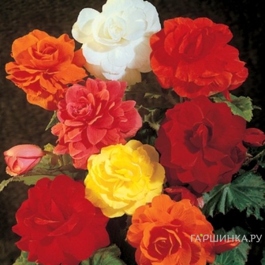 Бегония махровая Дубль Микс - кустовая клубневая бегония. Кусты компактные высотой 35 см, различной окраски, с прямостоячими стеблями. Соцветия крупные, махровые, ароматные, диаметром до 10 см. Цветут в июне-октябре. Яркий микс из махровый бегоний.