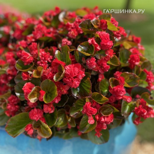 Бегония махровая Дубль Ред - кустовая клубневая бегония. Кусты компактные высотой 15-30 см, с прямостоячими стеблями. Соцветия крупные, махровые, насыщенно красного оттенка ароматные, диаметром до 12 см. Цветут в июне-октябре.