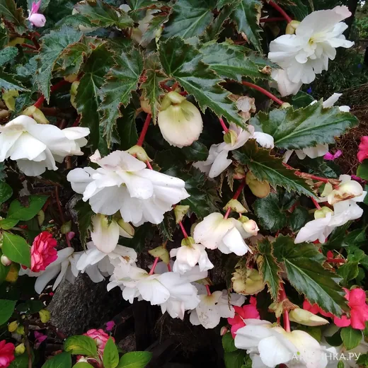 Побеги длинные, гибкие, равномерно покрыты листвой и цветками, которые раскрываются постепенно и сохраняют декоративность на протяжении всего сезона. Куст формируется компактно у основания, а свисающие побеги создают плотный цветочный поток. Бегония отлично подходит для балконов, террас, веранд и оформления входных зон, где белые цветы создают ощущение свежести и лёгкости.