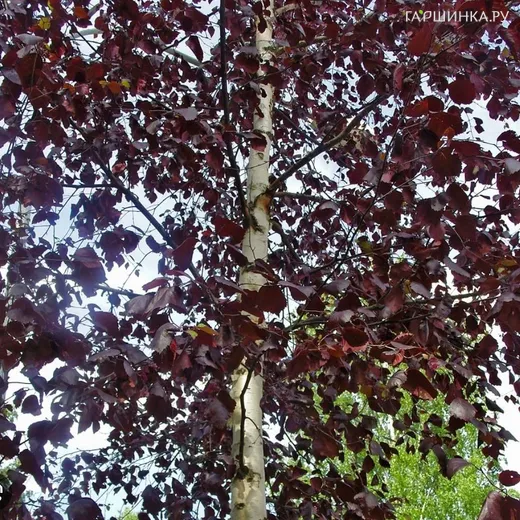 Береза повислая Роял Фрост - неприхотливое дерево с пирамидальной кроной и декоративной листвой, высотой до 9 м. Особую декоративность придает сочетание бордово-пурпурной окраски листьев, имеющих глянцевую поверхность, и белого ствола. У молодого растения кора бронзовая, и только с возрастом приобретает эффектную белую окраску. Ствол прямой. Листья ромбические, длинночерешковые, заостренные; молодые - клейкие, более старые - голые и блестящие.
