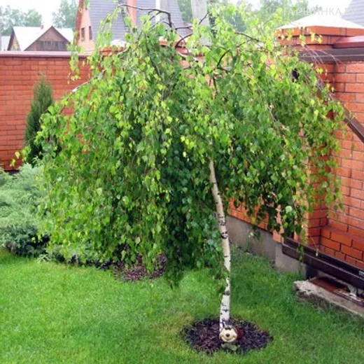 Береза повислая Юнга - Идеальная плакучая форма для небольших садиков. Маленькое деревце с очень плакучей, ажурной и не густой кроной. Маленькое дерево, живописное, медленнорастущее, с зонтикообразной, плакучей кроной, высотой до 5 м и шириной до 3 – 4 м, кора белая, гладкая, имеются редкие черные трещины, побеги гибкие. Живет до 120 лет, реже до более взрослого возраста. Ветки голые, покрыты многочисленными густорассыпчатыми смолистыми желёзками-бородавочками. Молодые ветви повисают вниз до самой земли, что придаёт кроне берёзы очень характерный облик зонтика. Крона ветвистая, но не густая. Листочки светло-зеленые, меньше, чем у видового растения, заостренные, треугольные, по краю пильчатые, распускаются ранней весной, а осенью приобретают неподражаемую желтую окраску. Листья от ромбически-яйцевидных до треугольно-яйцевидных, гладкие, в молодом возрасте клейкие. Цветы представляют из себя желтоватые соцветия - сережки, медоносны, цветение происходит до распускания листьев в апреле – мае. Корневая система поверхностная, может поднимать дорожные покрытия, чувствительна к уплотнению почвы и засаживанию приствольного круга, наличию дренажа, интенсивно развивается.