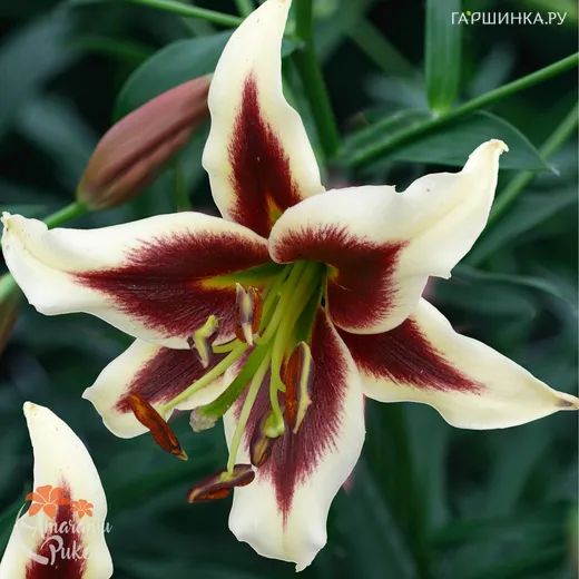 Лилия Беверли Дрим ОТ-гибрид - высокорослый сорт с очень крупными двухцветными цветками. Они достигают размера 20-25 см. Каждый из шести лепестков окрашен в два основных цвета – белый и насыщенный бордовый с легким винным оттенком. Бордовый находится ближе к сердцевине, причем на границе разделяющей эти два цвета, образуется замысловатый рисунок. Растения обладают крепкими побегами и статным ростом. Высота: 100 -110 см. Цветет в июле-августе.