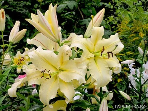 Очень высокая лилия, одно растение - большой куст. Цвет правда не ровно-желтый, а белый с желтой серединой. Пахнет сильно, будьте аккуратны.