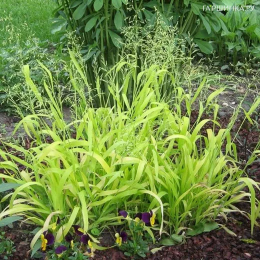 Бор развесистый Ауреум - многолетник 45 см высотой, с короткими ползучими корневищами. Стебли прямостоячие. Листовые пластинки 0.5—1.5 см шир., плоские. Метелки широко раскидистые, 12—30 см дл.; колоски 0.2—0.3 см дл., одноцветковые; колосковые чешуи равны колоску, кожистоперепонча-тые, ланцетно-яйцевидные; нижние цветковые чешуи яйцевидные, тонкокожистые, гладкие и блестящие, безостые, на спинке без киля. Цветет в конце весны—начале лета. Интересная форма с желтеющими на солнце листьями. Обладает удлиненным корневищем, требует ограничения. Растение разреженных лесов, предпочитает легкую полутень в прохладном климате. Полная тень уменьшает не только летний стресс, но и яркость желтой окраски листьев. Лучше всего его молодые яркие листья выглядят весной, летом слегка зеленеют. Можно использовать в качестве средневысокого бордюра или яркого желтого пятна в миксбордере.